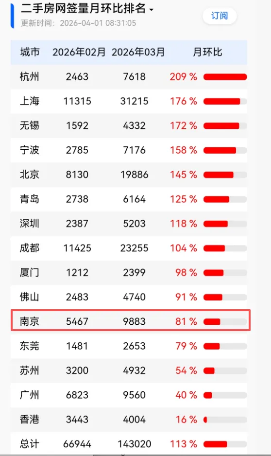 数据显示,3月南京新房卖出6096套,环比大涨208%!而“宁六条”发布11日新房认购量增加1.5倍;3月南京新房、二手房共卖掉近1.6万套,市场热度回升至去年同期水平,位居全国前列——从全国主要城市排名来看,南京新房成交规模、网签量月环比均高居全国第四,整体市场需求旺盛、容量较大,稳居全国前列,也为后续市场持续活跃打下了良好基础。二手房方面,南京二手房成交规模排在全国第四,仅次于上海、成都、北京,和广州水平相近。与成交量同步变化的,是价格的企稳信号。