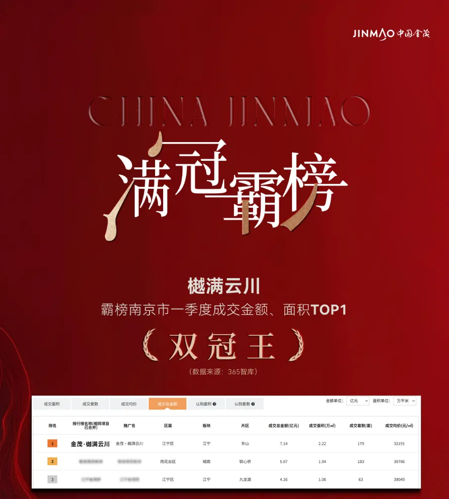 江宁金茂府强势垄断南京市一季度总价500万+项目成交金额、套数、面积TOP1“三冠王”,尽显高端市场统治力;