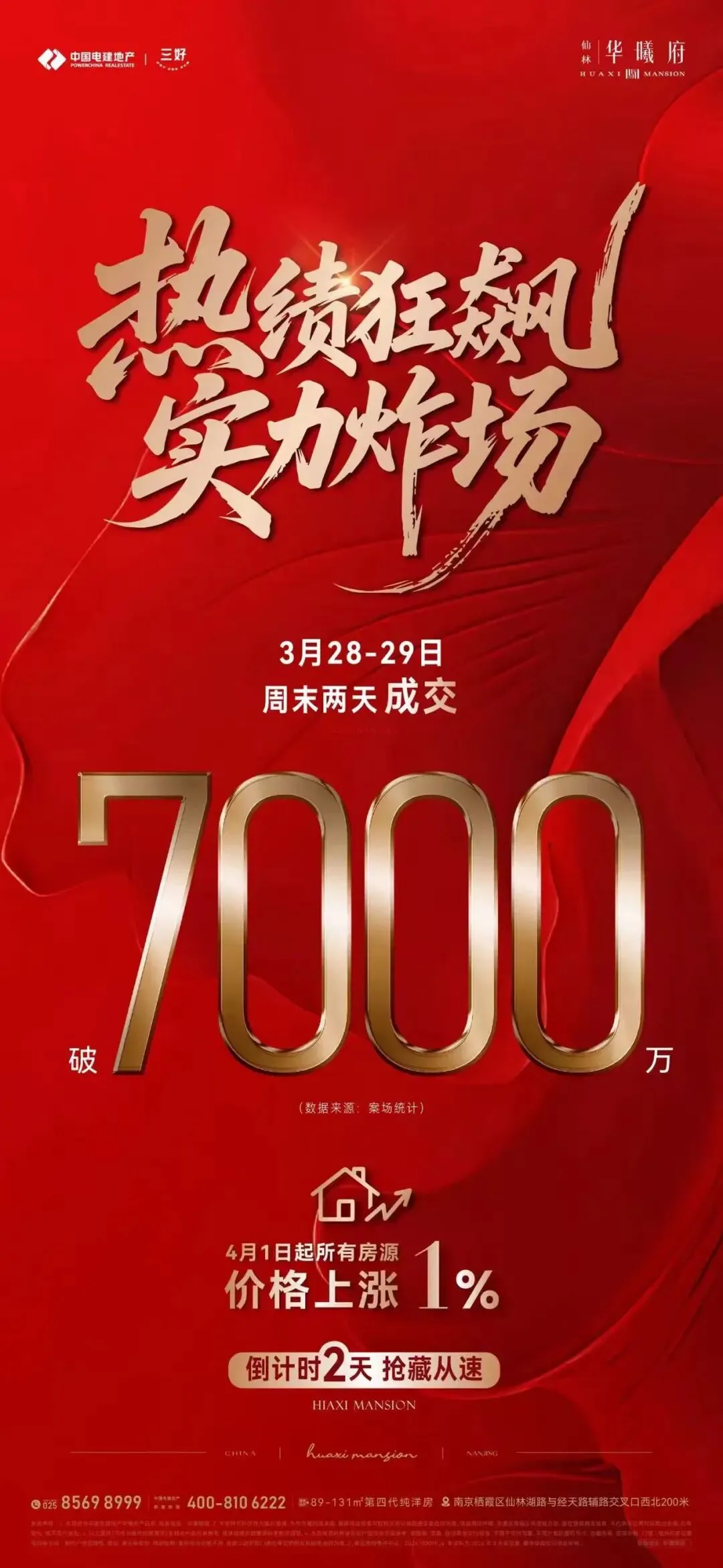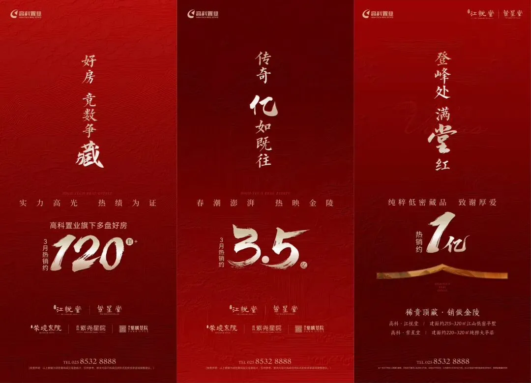 南站秦淮新河旁映秦淮,3月劲销超2.89亿元,据说马上还要有洋房新品加推;河西顶豪中海江南玖序,在人才补贴政策的助力下,疯狂成交,3月销售额突破2亿元。城东红盘仙林华曦府打出海报:上周末两天成交额破7000万元,4月1日起所有房源价格上涨1%!城北燕子矶龙湖龙智造·北城央璟颂项目3月劲销「2.68」亿,用实打实的业绩坐稳北城顶流;南京高科置业旗下多盘,3月热销约120套,卖出3.5亿;桥北上城十号院,一季度成交2.6亿元,套数、金额、面积、均价四项均是板块TOP1;河西中改善盘中建合玺东方凭借凭借自身产品力同样收获了不错的成绩,3月热销2亿+ ,持续领跑板块改善市场;