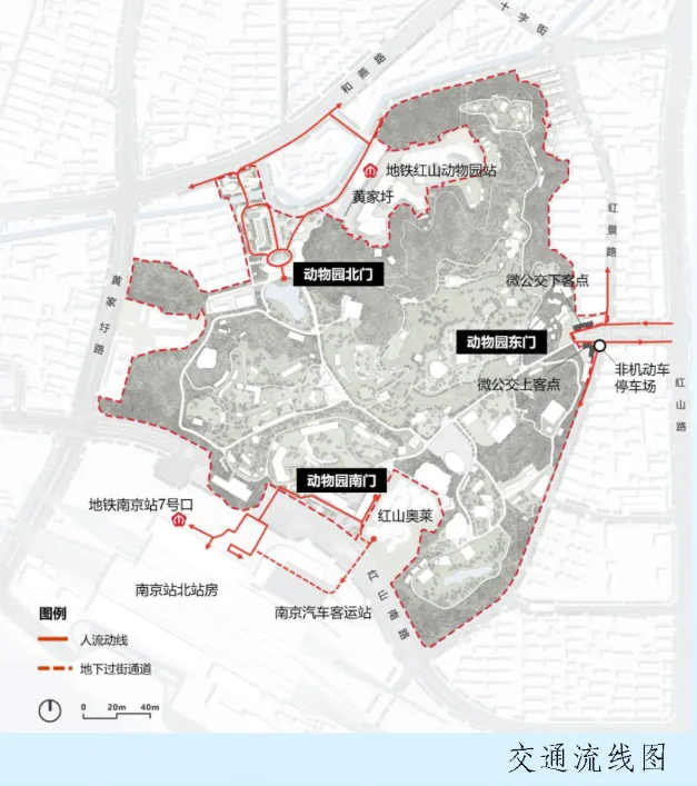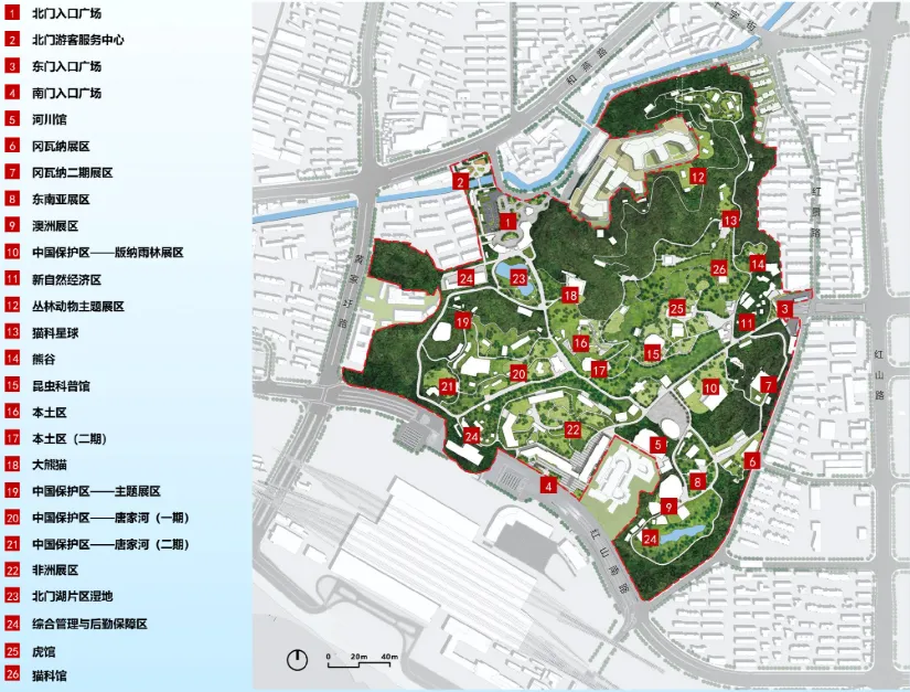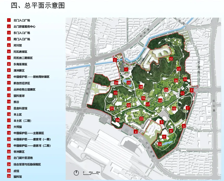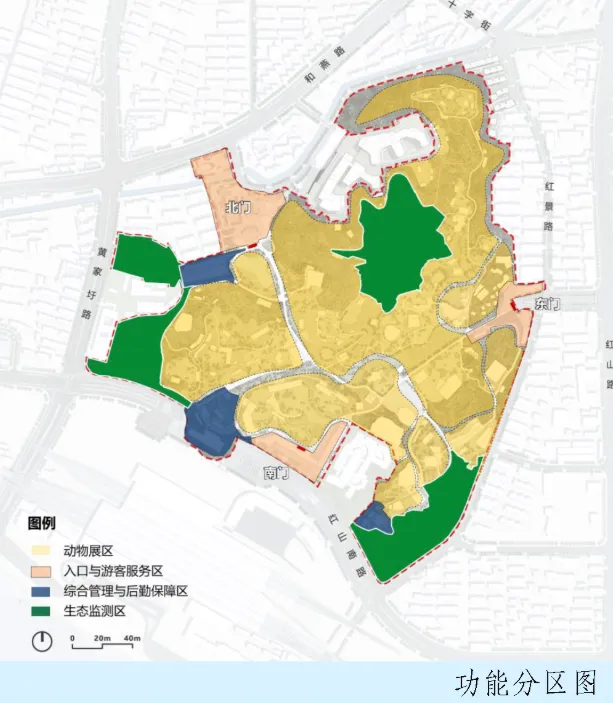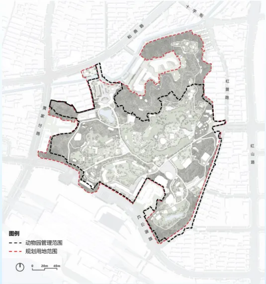 南京红山森林动物园位于南京主城北部红山地区,地处玄武、鼓楼、栖霞三区交界,毗邻南京站枢纽与紫金山,是城市生态绿心的重要节点。园区依托山地地形与森林资源,是国内少有的中心城区山地型森林动物园。建园以来,园区通过多轮改造提升,在动物保育、展示条件、基础设施、科普教育及游客服务等方面取得显著成效。但随着客流增长、动物福利提升及公众生态教育需求增强,现有规划在空间结构、功能体系和服务能力上需要加强。为助力红山动物园高质量发展,围绕“科研协同、科普教育、融合发展、文化休闲”,系统优化生态基础、保育体系、空间布局、游览与服务体系等。规划提出“一园融三山、三径汇一芯”总体空间结构,强化动物栖息环境与公共服务,促进城园融合与智慧低碳建设。通过规划引导,动物园将由传统观光型转型为“生态保育、教育研究、文化体验”复合型城市动物园,成为生态文明与自然教育的重要载体。