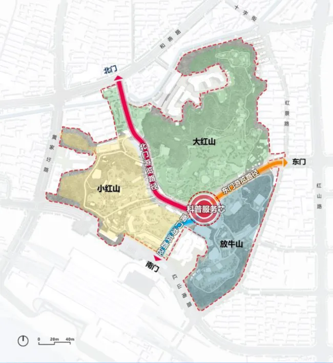 规划范围:包含大红山、小红山、放牛山、和尚山全部山体范围,并由动物园主要功能区及山前入口广场区构成,总面积约为69.3公顷。本项目统筹考虑与环红山周边片区在空间衔接、功能配置及交通组织等方面的协同关系,实现整体协调发展。