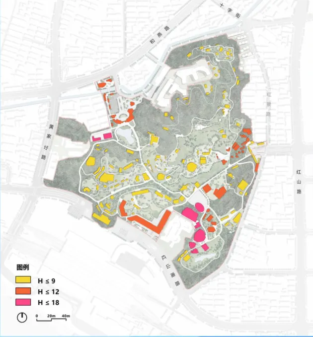 七、建筑规模与高度根据动物园原有地形地貌,实行差异化建筑高度限制。建筑物高度应控制在不遮挡山体背景、不破坏重要视线通廊的范围内,保证整体景观协调性。为适应发展需求,现将园内规划建筑总面积提高为13.4万平方米。建筑高度分为以下三个层级:单层或9米以下;一般不超过12米,(即不高于三层);以功能需求为导向,但应控制在18米以内。
