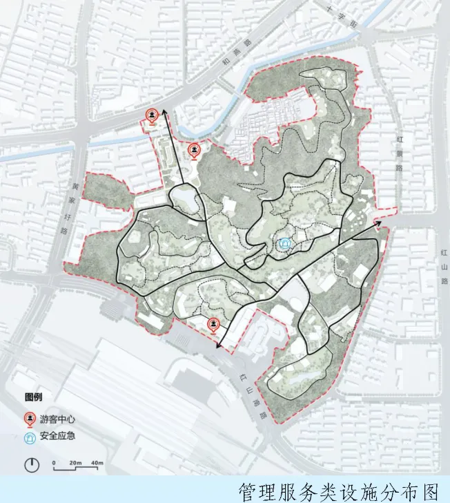 十一、配套服务设施管理服务类设施:在南门、北门区域设置游客服务中心。集成游客接待、商业零售、餐饮服务、行李存取、安全应急、智慧导览等多功能,构建“多功能整合+智慧服务+生态友好”的综合型服务空间。