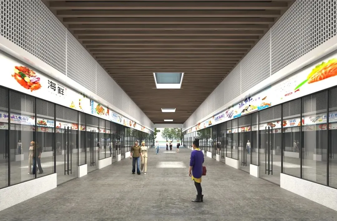设计团队摒弃传统水产批发市场“脏乱差”的交易环境,通过均衡布置自然采光通风井,在平面中形成有序的空间序列。同时,将首层净高提升,利用穿孔格栅遮挡设备夹层,确保交易通道整洁疏朗,营造出通透宜人的交易氛围。