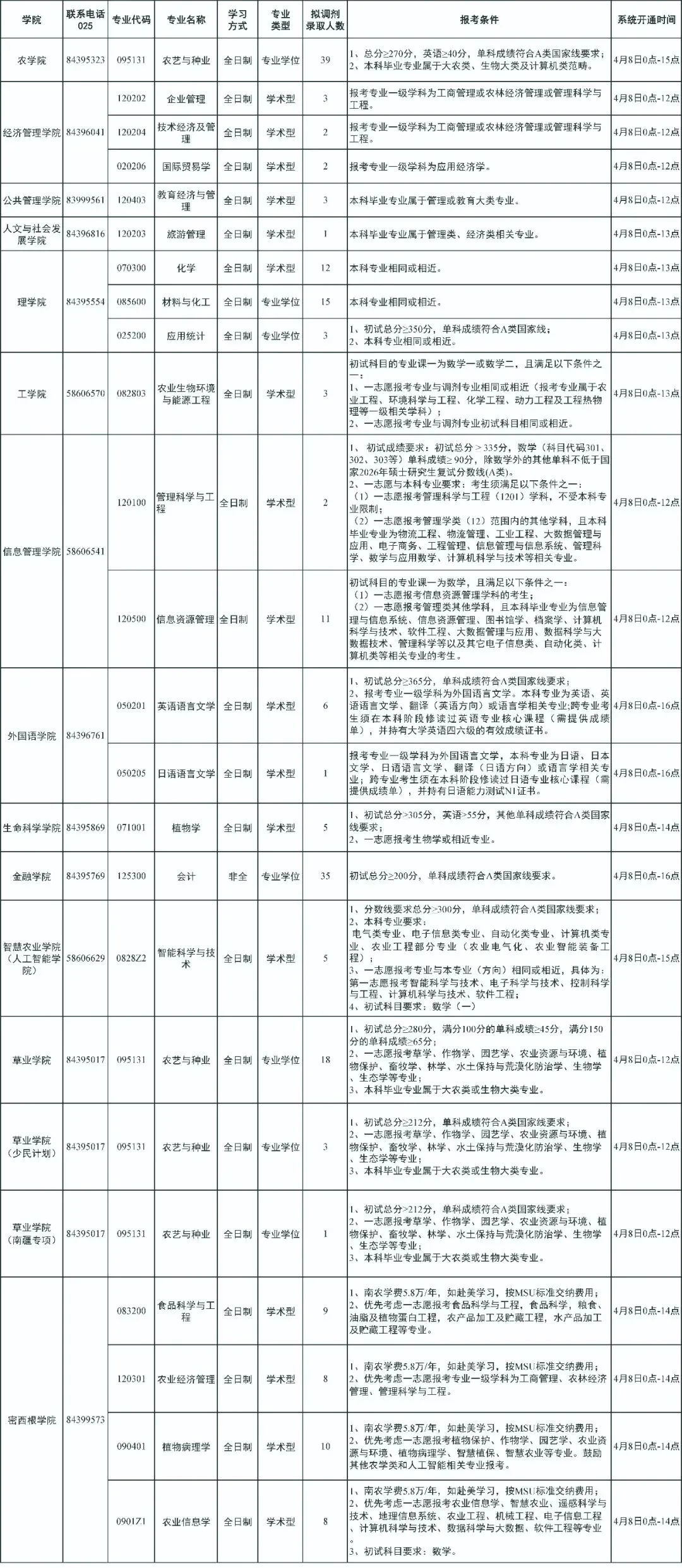 “退役大学生士兵”专项计划考生申请转为普通计划和其他符合加分政策的调剂考生,加分后满足调剂专业分数要求者请于4月8日8:00前按照《南京农业大学2026年硕士研究生复试准备工作通知》要求提交材料,否则后果自负。