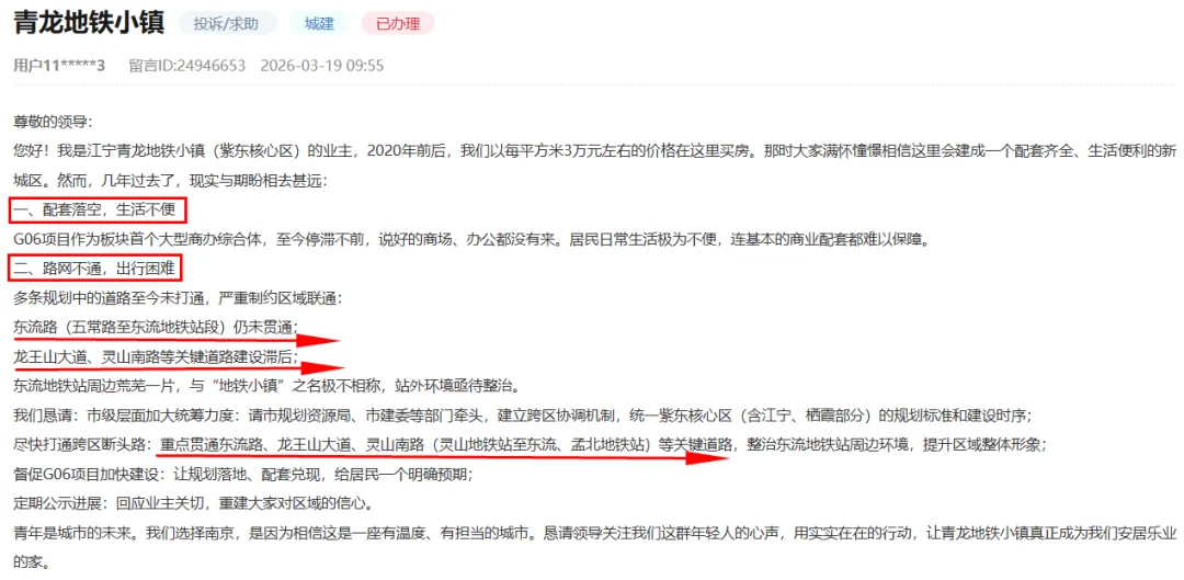 3月19日,有业主发布了一篇近600字的小作文,道出了一肚子“苦水”,咨询了目前青龙地铁小镇的多个配套进展。
