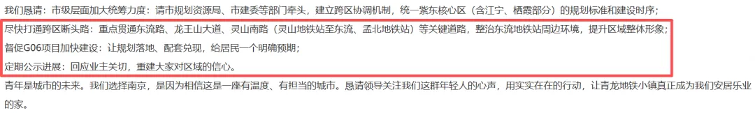 ②督促G06项目加快建设:G06项目作为板块首个大型商办综合体,至今停滞不前。让规划落地、配套兑现,给居民一个明确预期;