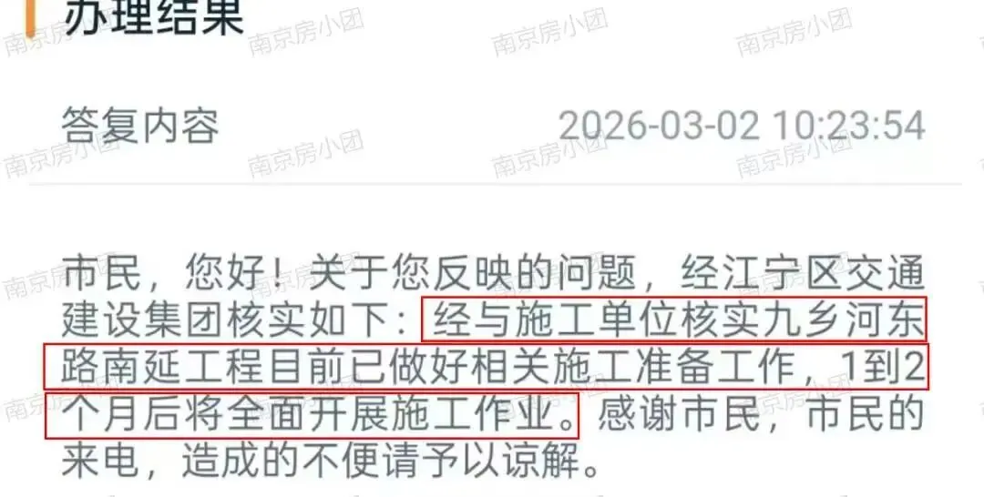 加上,在3月2日官方已经明确回复了,九乡河东路南延工程(也就是:捷运大道九乡河东路-区界)已经做好相关施工准备工作,1-2个月后将全面开展施工作业!