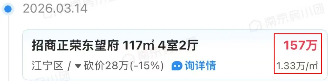 3月14日,招商正荣东望府成交了一套建面约117㎡房源,成交总价157万,成交单价为1.33万/㎡。