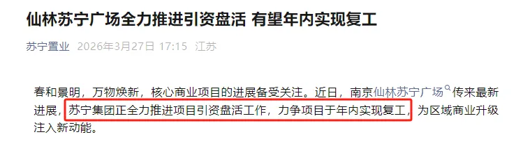 停工多年后,南京两大重要综合体,在最近传来好消息。南京大悦城,定档今年6月1日全面复工,预计2027年8月30日竣工,江北浦口城南中心有望迎来超15万方旗舰商场;仙林苏宁广场,被苏宁集团列为2026年重点盘活项目,力争今年年内复工,为区域商业升级锦上添花。01