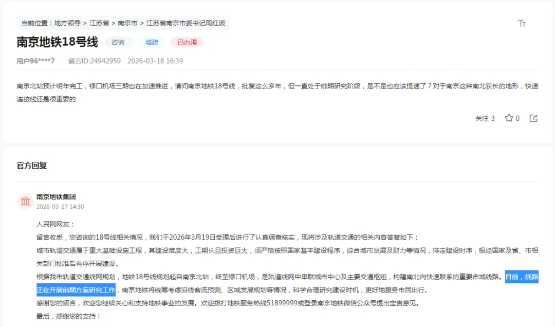 地铁18号线:网友催更,官方回应“还在前期研究”。