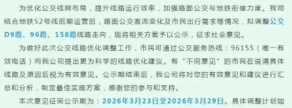 3月24日,南京公交集团发公告:结合宁马城际(S2号线)后期运营,计划调整D9路、96路、158路。意见征集3月29日截止,不出意外,本月就开通!