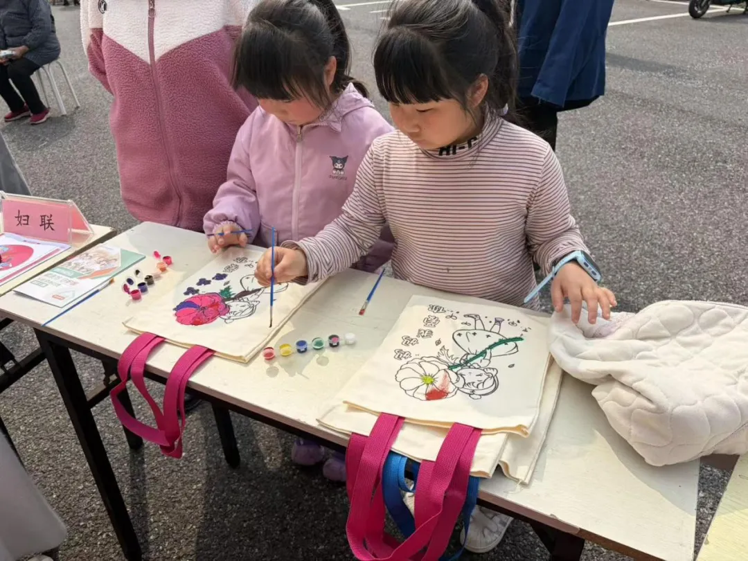 与此同时,卫生院与卫健办联合设置的便民服务点前人头攒动,医护人员为群众提供免费血压血糖测量、健康义诊、慢性病咨询等服务,普及健康生活方式。广场一侧的手工体验区同样热闹非凡,孩子们手持彩笔认真在帆布袋上绘制 “孝老爱亲” 主题图案,家长们在一旁耐心指导、共同创作。