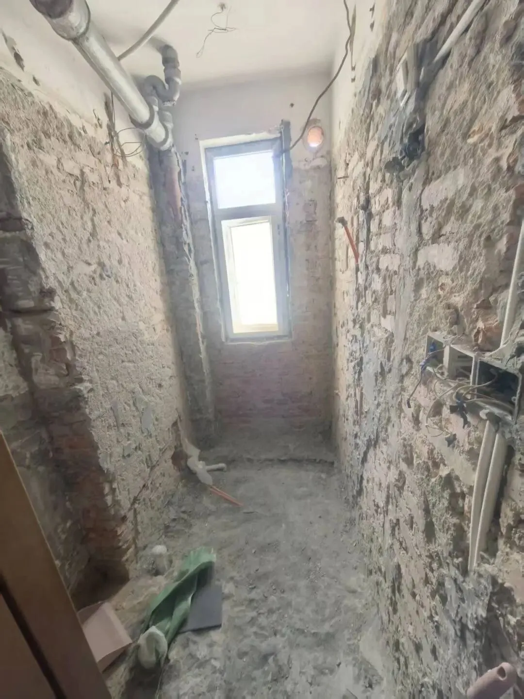 改造第一天,施工师傅拆除陈旧瓷砖、潮湿墙体、老化吊顶,清理干净后露出原始楼板和管道。