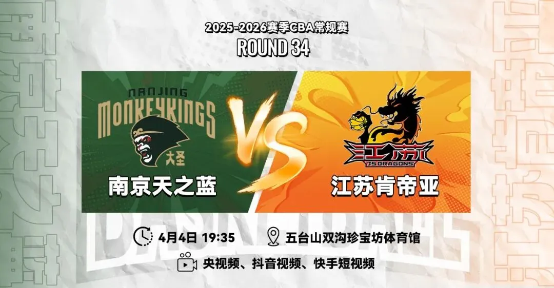 4月4日19:35,2025-26赛季CBA常规赛第三十四轮,江苏肯帝亚将于南京迎来对战南京天之蓝的比赛。