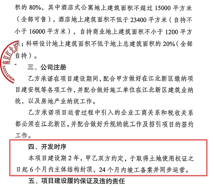 在地块投资发展监管协议中显示,本项目建设期2年,甲乙双方约定,于取得土地使用权证之日起6个月内主体结构封顶,24个月内竣工备案并同步运营。