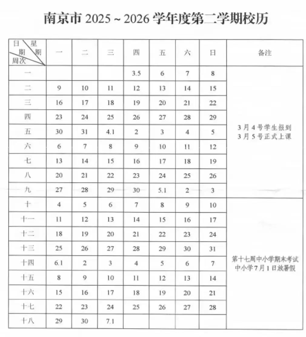 2026年南京中小学下学期校历安排,本学期一共18周,第9周安排期中考试。