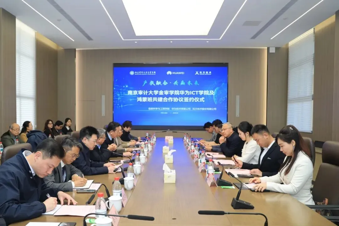 4月1日下午,南京审计大学金审学院鸿蒙创新班共建合作协议签约仪式在学校图书馆一楼会议室隆重举行。南京审计大学金审学院与华为技术有限公司、深圳市讯方技术股份有限公司三方携手共建鸿蒙创新班,同步启动鸿蒙全栈全场景实训室建设,以产教融合、校企协同、资源共享、共赢发展为宗旨,聚力打造ICT与鸿蒙生态人才培养高地,共同开启服务数字中国战略、培育高素质应用型人才的崭新篇章。