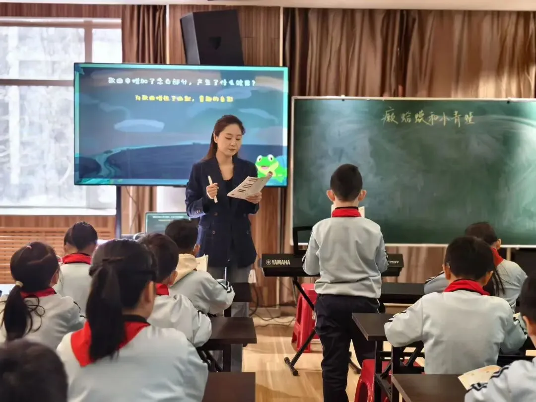 聂亚雯老师带来四年级下册风趣活泼的《癞蛤蟆和小青蛙》。课堂围绕角色形象塑造展开,她聚焦节奏难点与中强(mf)、中弱(mp)力度记号教学,引导学生精准把握癞蛤蟆与小青蛙的不同音乐形象,并运用力度、音色和表情塑造角色。借助AI虚拟场景创设“癞蛤蟆和小青蛙邀请同学们参加音乐会”的趣味情境,自然开启角色动作创编,学生参与度极高、课堂氛围热烈。课程结尾以“爱护动物”进行价值升华,将美育与德育有机统一,彰显了新锐教师与时俱进的教育理念。