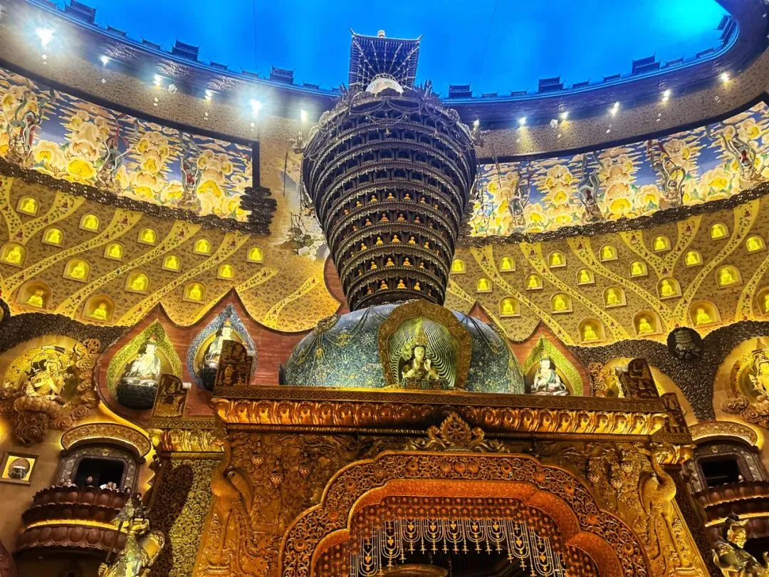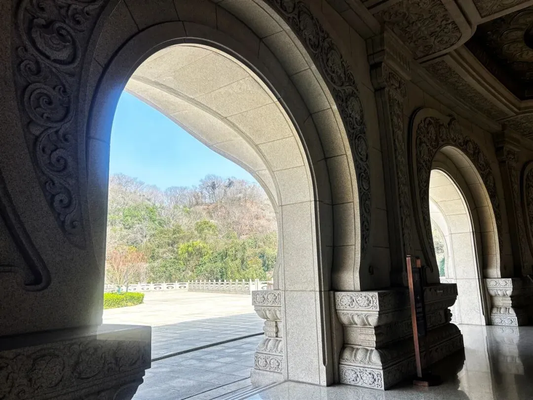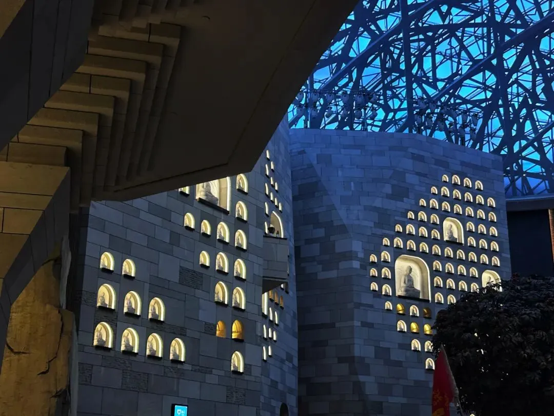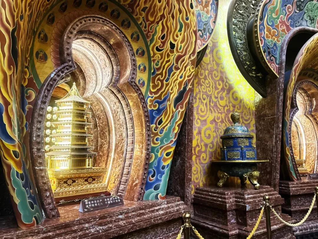 佛顶宫静静坐落于山谷之间,穹顶如莲,光影流转。金与白交织出圣洁的轮廓,阳光透过穹顶洒落,碎成万千光点,在地面与廊柱间缓缓游走,庄严而静谧。梵音轻扬,香火袅袅,尘世喧嚣在此被轻轻隔绝,只余下内心的安宁与澄澈。