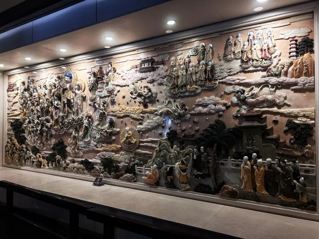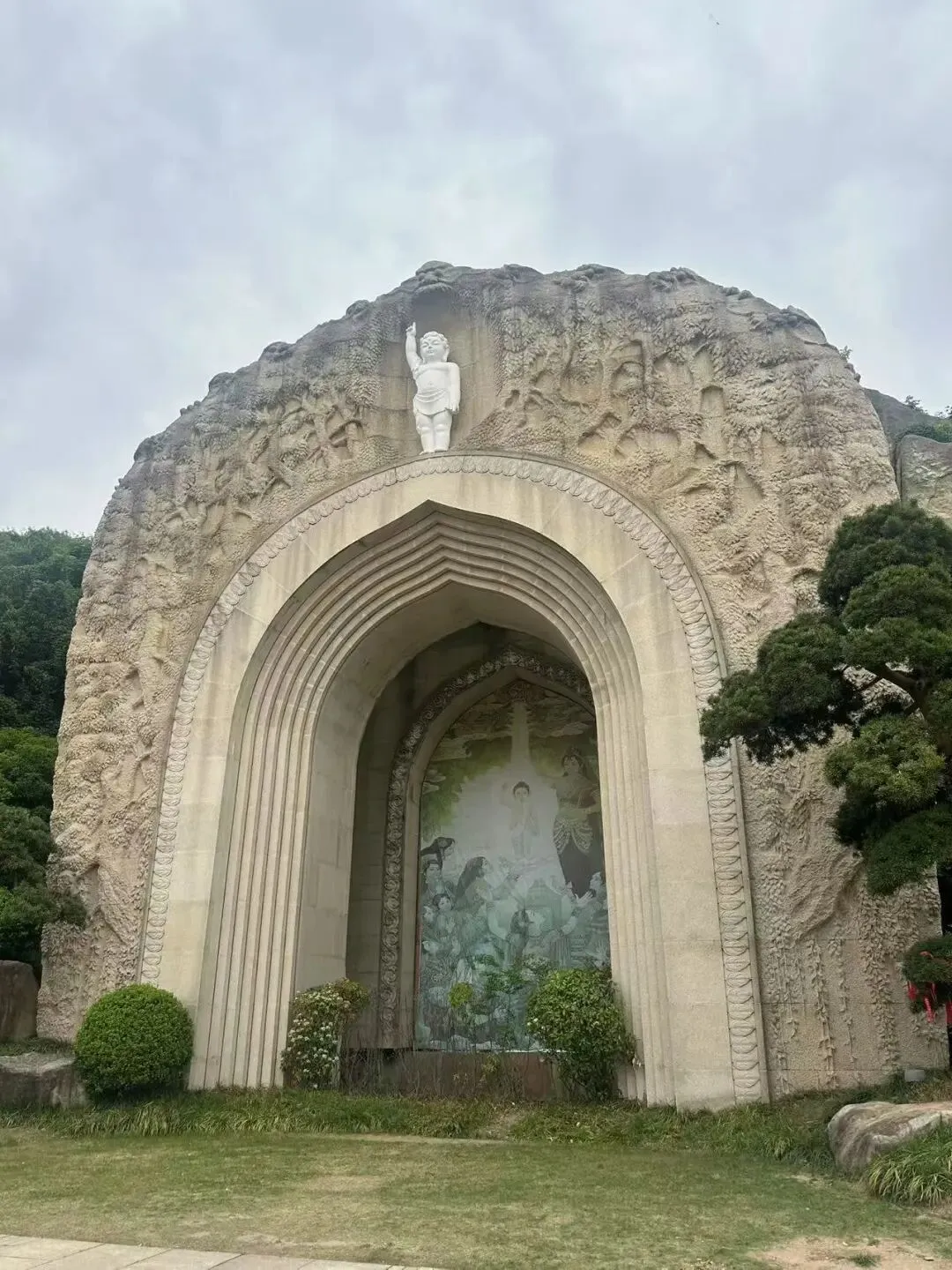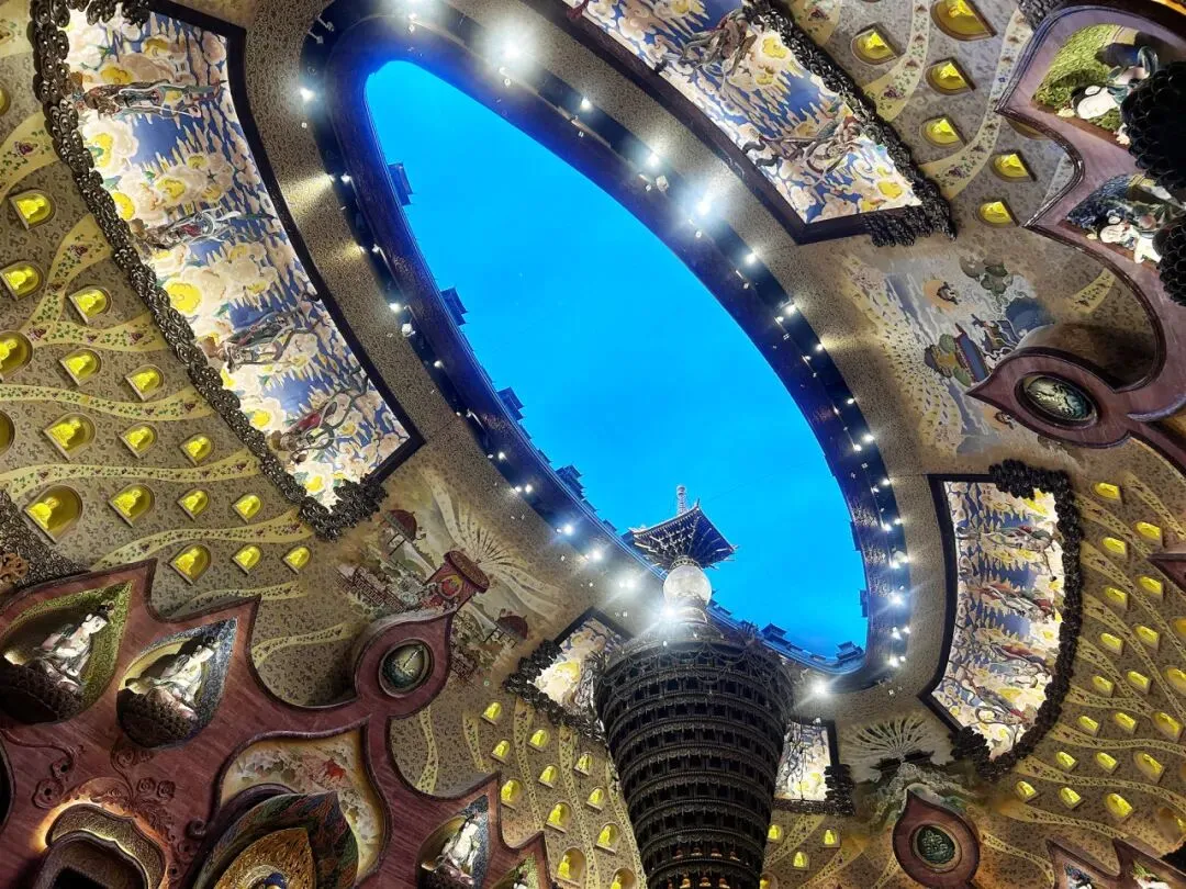 佛顶宫静静坐落于山谷之间,穹顶如莲,光影流转。金与白交织出圣洁的轮廓,阳光透过穹顶洒落,碎成万千光点,在地面与廊柱间缓缓游走,庄严而静谧。梵音轻扬,香火袅袅,尘世喧嚣在此被轻轻隔绝,只余下内心的安宁与澄澈。