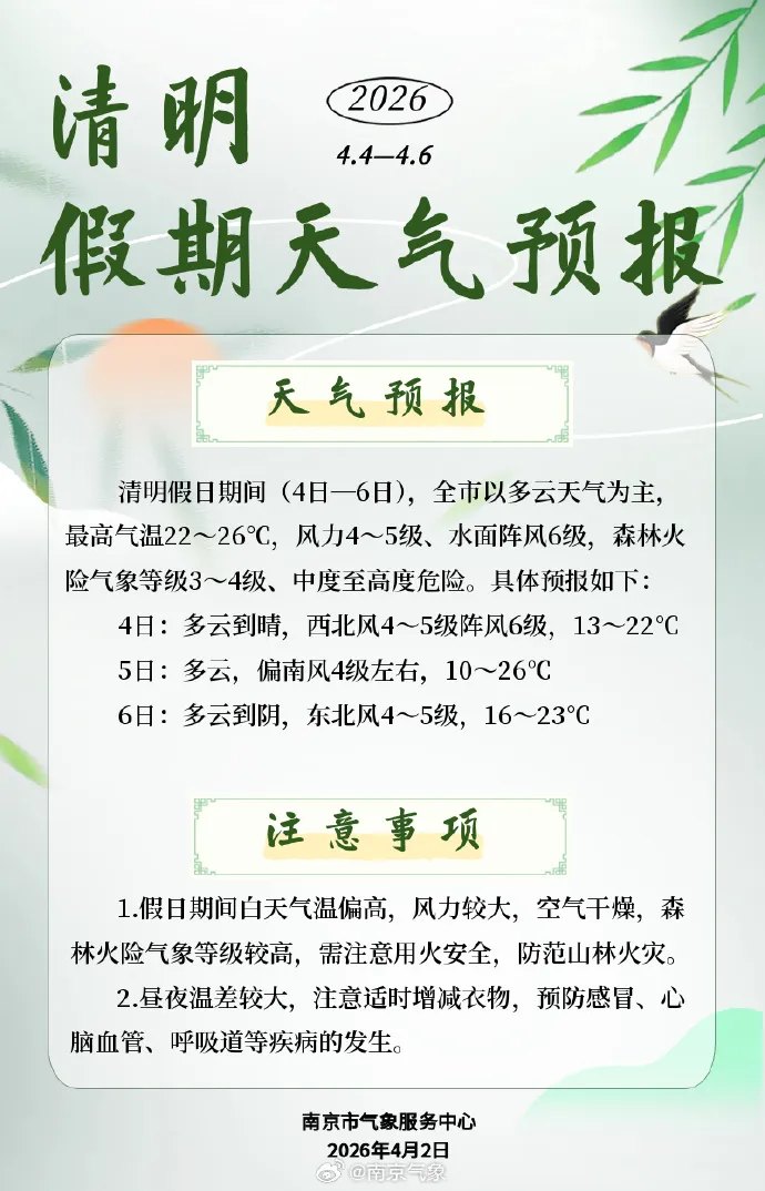 4月4日全市多云到晴西北风4到5级4月4日最高气温: 21℃到22℃4月5日最低气温: 10℃到11℃4月5日全市多云偏南风4到5级阵风6级4月5日最高气温: 26℃左右4月6日最低气温: 15℃到16℃