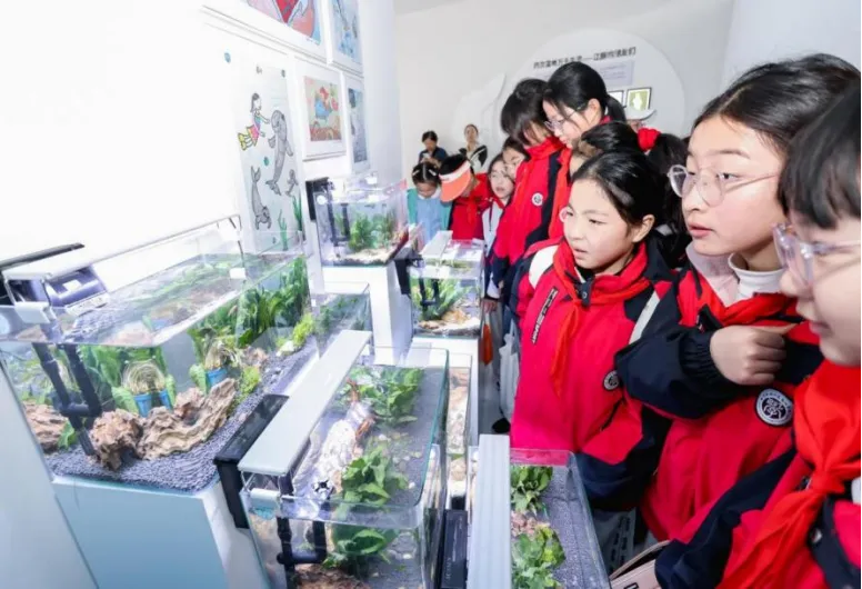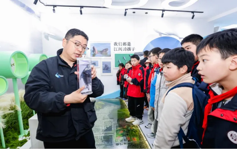 在驿站内,从珍稀鱼类标本到长江流域生物链,在南京江豚水生生物保护协会专家的生动讲解下,孩子们听得格外认真,好奇的小脸上写满了对长江生态的探索欲。互动装置前围满了跃跃欲试的小朋友,指尖触碰屏幕的瞬间,仿佛真的置身于鲜活的长江生态之中。