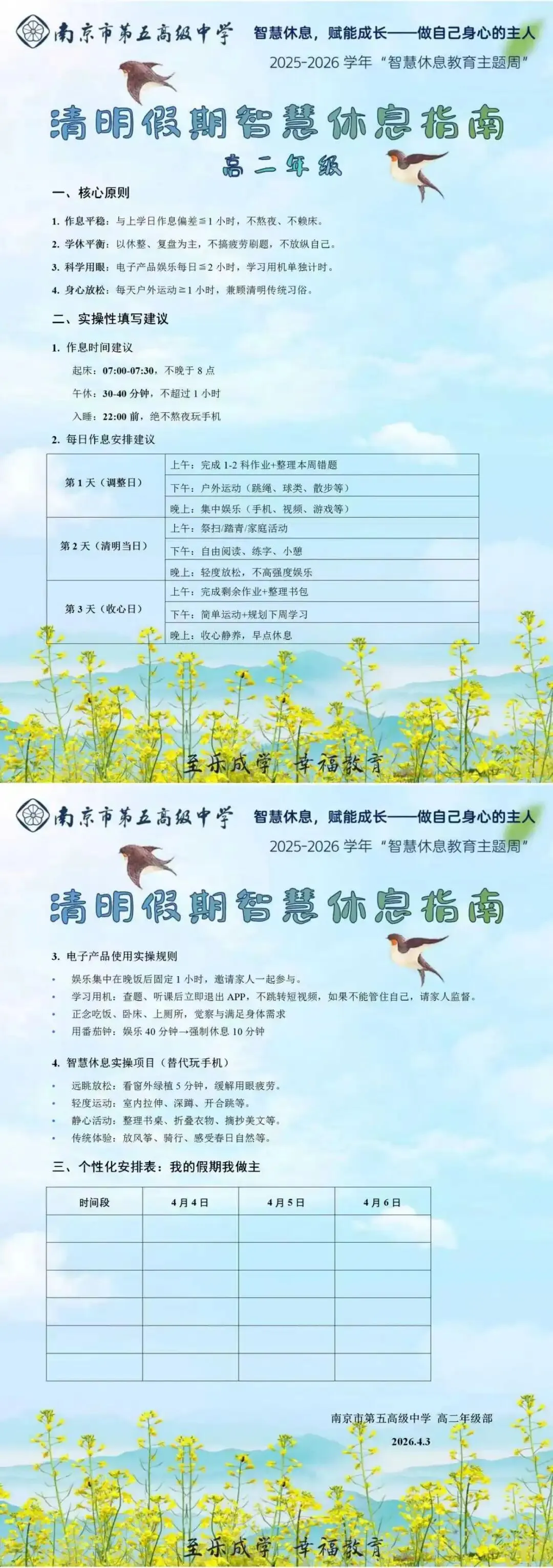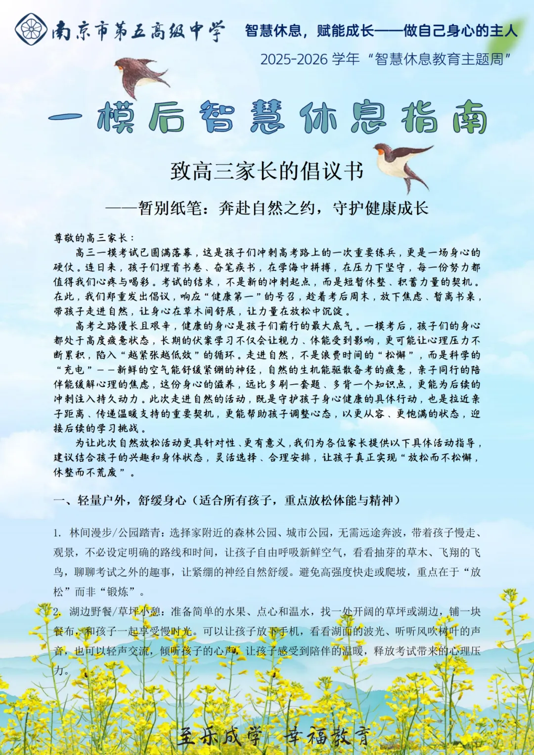 随后,南京五中高三、高二年级部以“息育”课程为引领,向全体家长发出“暂别纸笔,奔赴自然之约”的倡议,将“智慧休息教育”从课堂延伸至家庭、从理论落地为实践。