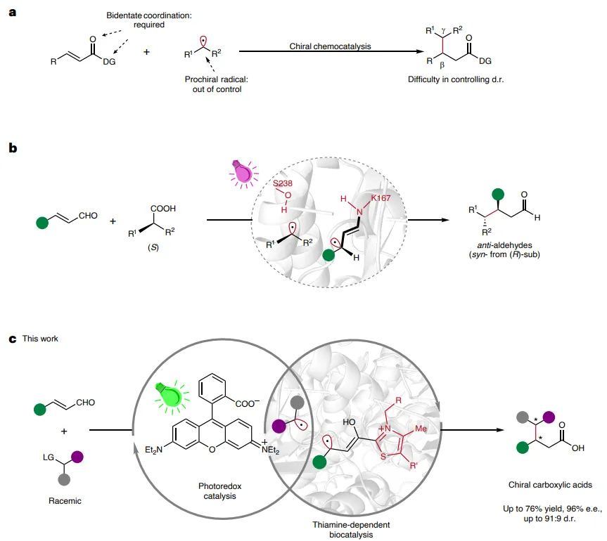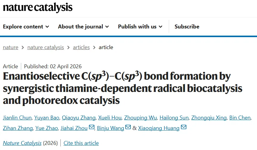 2026年4月2日,南京大学黄小强、厦门大学王斌举、中国科学院深圳先进技术研究院周佳海在国际知名期刊Nature Catalysis发表题为《Enantioselective C(sp3)–C(sp3) bond formation by synergistic thiamine-dependent radical biocatalysis and photoredox catalysis》的研究论文,Jianlin Chun、Yuyan Bao、Qiaoyu Zhang为论文共同第一作者,黄小强、王斌举、周佳海为论文共同通讯作者。