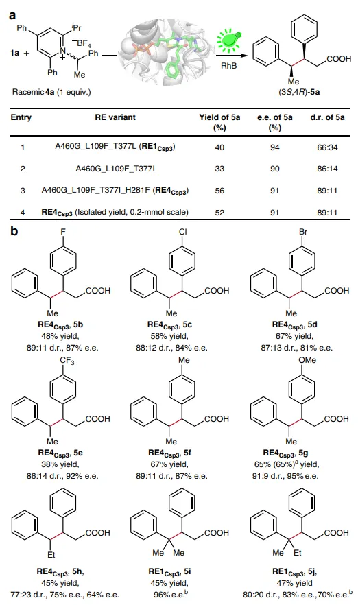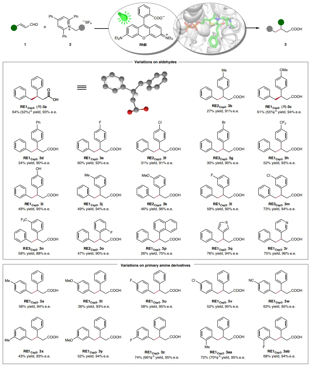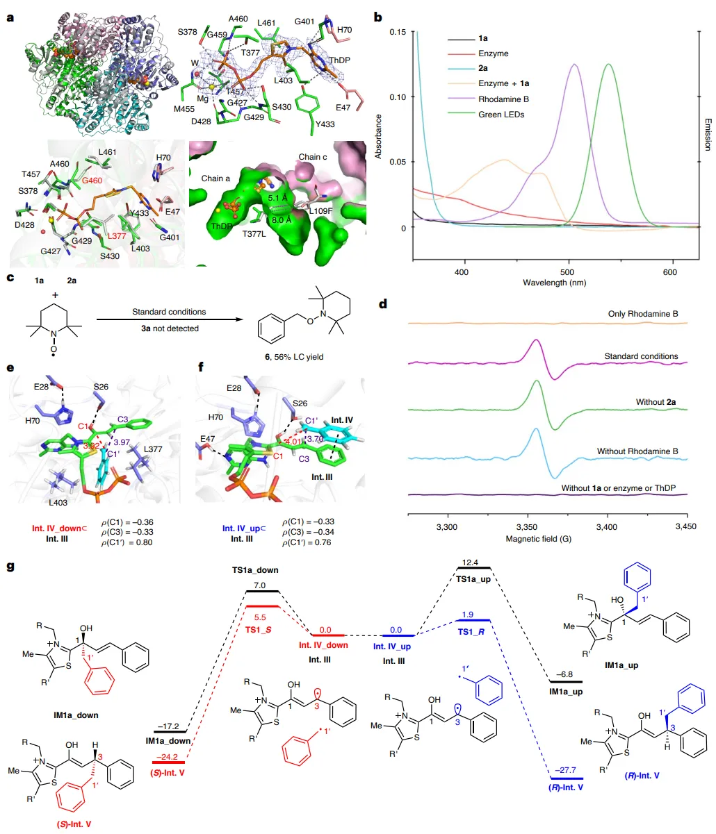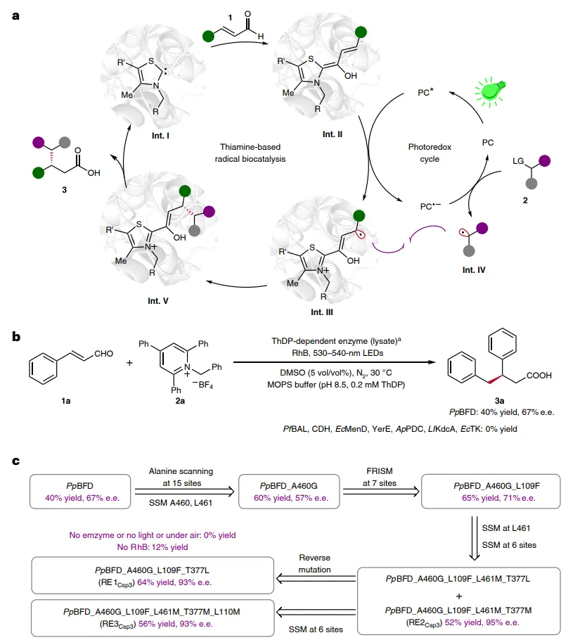 该系统将简单的肉桂醛转化为富含对映体的羧酸,这些羧酸带有有价值的β-或β, γ-C(sp3)手性中心,这是一种用常规方法难以实现的“非天然”转化。通过定向进化,作者精确地控制了烷基自由基,实现了立体选择性的C(sp3)–C(sp3)键形成(38个例子,对映体过量最高达96%,非对映异构体比例最高达91:9)。研究表明,重塑另一类硫胺素依赖性酶可以扩展自由基生物催化的范围。现代自由基化学为C(sp3)-C(sp3)键的形成开辟了一条强有力的策略,但自由基的使用在化学、非对映和对映选择性的控制方面仍然存在挑战。例如,C-自由基与羰基取代烯烃(Michael受体)的自由基共轭加成,也称为Giese反应,已被充分证明可用于合成远离羰基的C-C键。然而,通常需要双齿配位底物来控制前手性烯烃的立体化学。与化学催化剂配位的前手性Michael受体通常能得到更好的控制,但前手性C-自由基尚未得到有效调控。换句话说,在化学催化的Giese型自由基加成中,实现非对映选择性更具挑战性。酶在选择性和可进化性方面具有独特优势,使其成为调控自由基极具吸引力的催化剂。作者质疑酶是否能提供一种可行的解决方案,以高对映和非对映选择性实现自由基C(sp3)-C(sp3)键的形成。理想情况下,应能直接利用简单的单齿烯烃,如肉桂醛。在此背景下,Melchiorre和Saravanan课题组独立地利用光照I类醛缩酶实现了肉桂醛的Giese型自由基偶联。这证明了酶控制共价结合的烯烃底物立体化学的能力。此外,Melchiorre的研究表明,(R)-2-苯基丙酸等对映纯自由基前体的手性可以通过酶活性位点中的弱相互作用得以保留。尽管取得了这些成就以及其他酶促C(sp3)-C(sp3)键形成的显著例子,但使用外消旋自由基前体实现对映和非对映选择性控制仍然是一个挑战。在本文中,作者报道了一种对映选择性(在某些情况下也是非对映选择性)的自由基C(sp3)-C(sp3)键形成反应,该反应由一种机理上独特的双重光生物催化系统实现。该系统包含一个有机光氧化还原催化剂和一个硫胺素二磷酸(ThDP)依赖性酶。在生命系统中,ThDP酶通过酶促Breslow中间体激活醛或酮酸底物,通过双电子umpolung途径形成C(sp2)-C键。最近,作者课题组和其他人已成功改造来自荧光假单胞菌(Pf BAL)的ThDP依赖性苯甲醛裂合酶,以实现芳香醛的对映选择性ipso-C(sp2)-C(sp3)自由基偶联。在作者继续努力开发“非天然”自由基生物催化的过程中,作者试图通过将α,β-不饱和醛的β-位作为前手性C(sp3)手性中心,来实现更具挑战性的远程自由基C(sp3)-C(sp3)键形成。然而,在作者之前基于Pf BAL催化的ipso-C(sp2)-C(sp3)形成的研究中,α, β-不饱和醛不能作为酰基自由基供体被耐受。此外,Müller及其同事的一项开创性报告表明,当α, β-不饱和醛在天然的双电子缩合反应中用作酰基供体时,ThDP依赖性酶天然地只提供对β-位的1, 2-加成而非1, 4-加成。在本文中,作者引入了一种光诱导的自由基机制,并改造了另一种不同的ThDP依赖性酶,即来自恶臭假单胞菌的苯甲酰甲酸脱羧酶(PpBFD),从而解锁了具有挑战性的C(sp3)-C(sp3)键形成反应。这种反应性不仅扩展了硫胺素依赖性酶的反应范围,而且还可以作为对化学催化N-杂环卡宾(NHC)自由基催化的补充。图1:利用简单肉桂醛进行C(sp3)-C(sp3)键形成的酶改造。(a)Giese型自由基C(sp3)-C(sp3)键形成的挑战。(b)直接光照I类醛缩酶以实现立体特异性自由基-自由基交叉偶联。(c)协同硫胺素依赖性酶促和光氧化还原催化以实现立体选择性C(sp3)-C(sp3)键形成。DG,导向基团;LG,离去基团。图2:设计与开发。(a)重新设计的催化循环。(b)硫胺素二磷酸(ThDP)依赖性酶的筛选。(c)PpBFD(PDB 1MCZ)的进化轨迹,以及每个变体的产率和对映体过量(e.e.)值,以及对照实验。标准条件:肉桂醛1a(0.012 mmol),Katritzky盐2a(0.004 mmol),酶(裂解液,2.5 mol%),罗丹明B(RhB,5 mol%),在50 mM MOPS缓冲液(pH 8.5,含2.5 mM MgSO4和0.2 mM ThDP)中加入5 vol/vol% DMSO,在N2气氛下于30 °C用530-540 nm LED照射搅拌20小时;反应总体积为2.5 ml。产率通过UPLC测定,并以2a为1当量基准。e.e.值通过手性固定相HPLC分析,在酯化衍生化后测定。a细胞裂解液通过超声处理获得,随后通过SDS-PAGE半定量。SSM,位点饱和诱变;FRISM,聚焦理性迭代位点特异性诱变。图3:具有一个手性中心的光生物催化C(sp3)-C(sp3)键形成的底物范围。除非另有说明,反应均在标准条件下(Fig. 2b)进行。产物产率通过UPLC或GC定量。e.e.值在酯化衍生化后通过手性固定相HPLC分析。绝对构型直接从3a和3c的单晶结构确定。a由0.4 mmol规模反应确定的分离产率。b由0.2 mmol规模反应确定的分离产率。图4:使用仲和叔苄基自由基的立体选择性C(sp3)–C(sp3)键形成。(a)Katritzky盐4a的反应进化。(b)底物范围研究。除非注明,1(0.012 mmol),Katritzky盐4(0.004 mmol),RE4Csp3(2.5 mol%,裂解液),RhB(5 mol%),在50 mM MOPS缓冲液(pH 8.5,含2.5 mM MgSO4和0.2 mM ThDP)中加入5 vol/vol% DMSO,在氮气气氛下于30°C用530-540 nm(LED)照射搅拌20小时。反应总体积为2.5 ml。产率通过UPLC定量,并以4a为基准。d.r.值通过UPLC和LC-MS确定,e.e.值通过未衍生化样品的直接分析或经酯化衍生化后的手性固定相HPLC确定。a由0.2 mmol规模反应确定的分离产率。b使用N-(酰氧基)邻苯二甲酰亚胺代替Katritzky盐。图5:机理研究。(a)野生型PpBFD(彩色)与RE1Csp3(灰色)的叠加(r.m.s.d.为0.198 Å)。(b)不同混合物的UV-vis吸收光谱和所用LED的发射光谱。(c)TEMPO捕获自由基。(d)低温EPR光谱。(e)MD模拟的Int. III