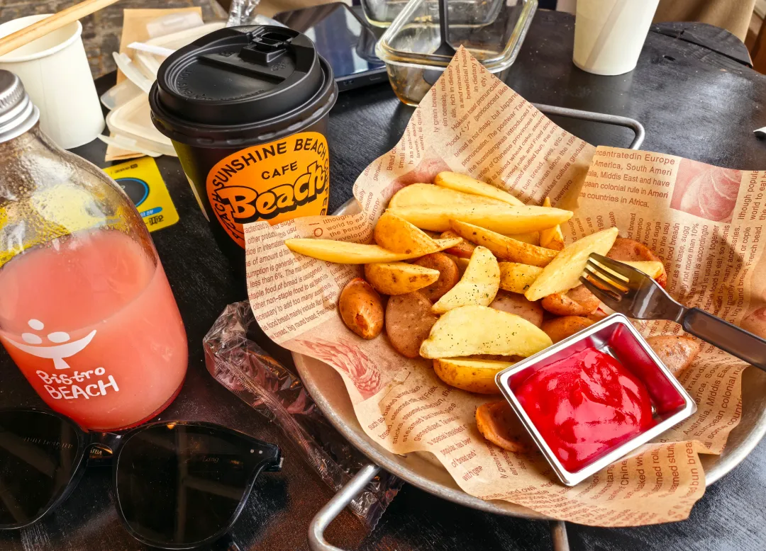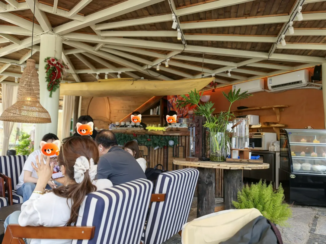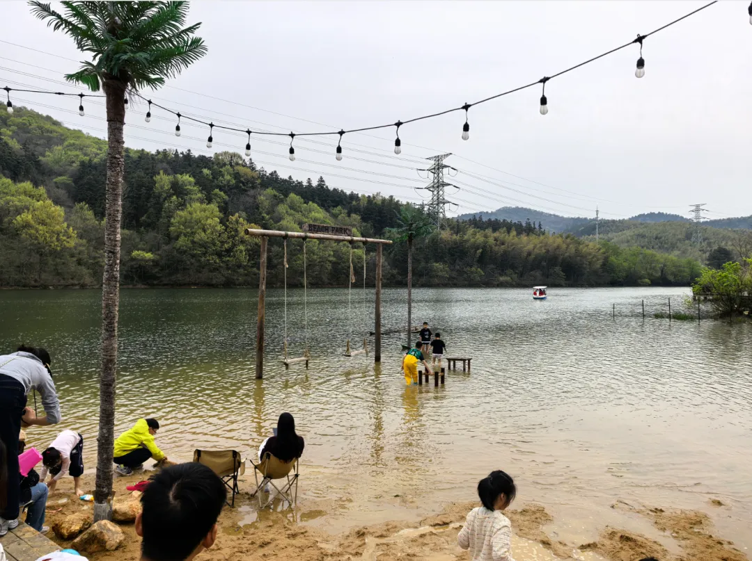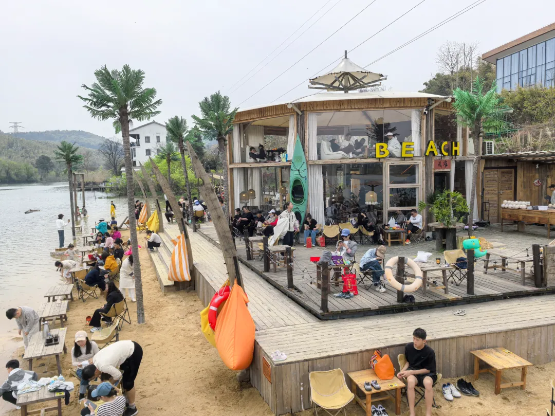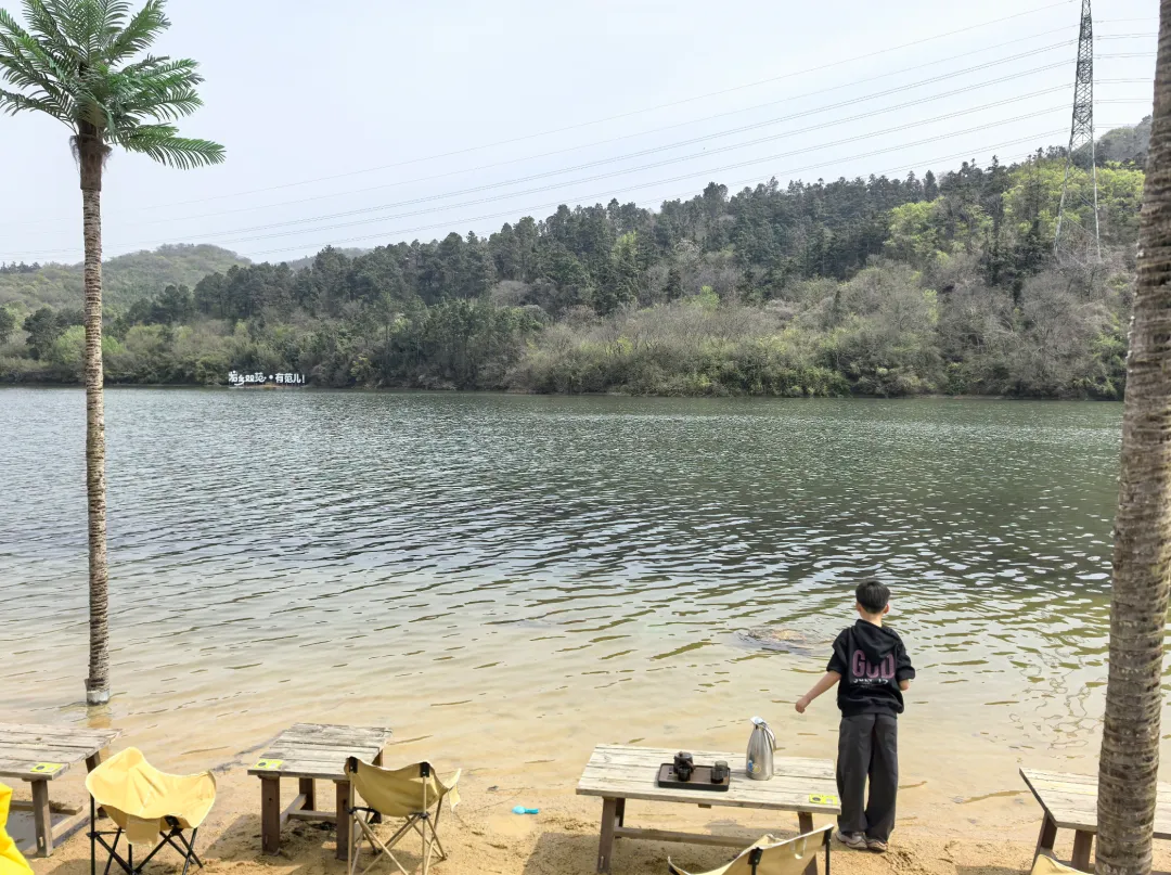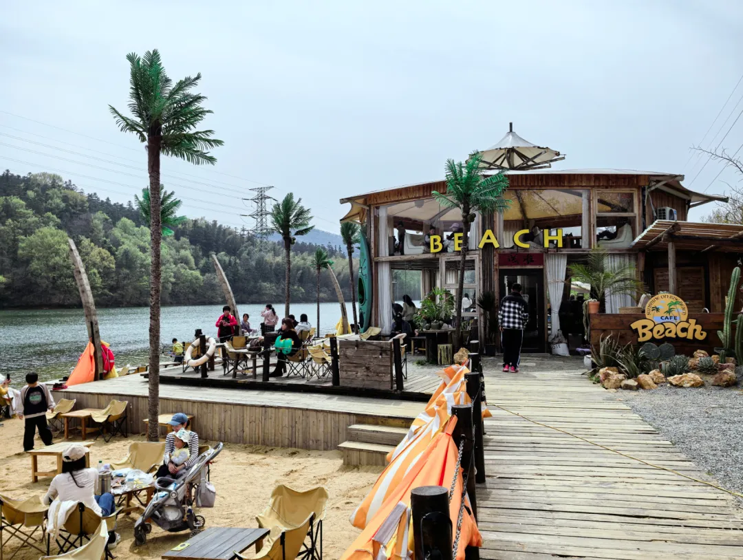 若不是亲眼所见,我还真不会相信南京竟然还有这样的好地方!不用飞东南亚,不用跑千里外的海边,就在南京江宁的山野里——藏着一片能躺平、能遛娃、能拍度假大片的 “小三亚”,清明小长假想找个地方放松的懒人朋友,直接抄我这篇作业!周末从市区开车出发,40分钟就到了江宁横溪,刚拐进小路,我就被眼前的景象震住了。澄澈的龙山水库铺展在眼前,水岸旁竟是一片绵软的白沙滩,挺拔的椰树、棕榈树错落而立,水上秋千垂在波光粼粼的水面上,沙滩上摆着木质沙滩桌和沙滩椅,风一吹带着湖水的清润感。这里就是我新近挖到的宝藏地 —— 浅滩咖啡,一家把咖啡馆直接建在湖滩上的神仙小店,这种差异化恐怕在南京的咖啡馆是独一无二了。这个清明小长假,不如就来这里,吹吹 “海风”,喝杯咖啡,解锁东南亚同款度假感。不爱喝咖啡也没关系,沙滩本身是公共空间,目测沿湖沙滩大约有两三百米长,比我预想中大很多,容纳百十来个人不成问题。有很多人自带饮料、食物,坐在软软的沙滩上,聊天、喝茶、打牌,晒着暖洋洋的太阳,什么工作、琐事都不用想,彻底躺平放松,这才是小长假该有的样子啊!带娃来的家长们彻底实现了解放双手,小朋友们拿着小铲子在沙滩上挖沙、在水边踩水,叽叽喳喳的笑声伴着“海”风,一玩就是一下午。上下两层,下面是沙发坐,上面是躺椅,怕晒太阳的可以坐进咖啡馆。咖啡馆是木质结构,所有的细节都散发着东南亚那味,说实话,在这坐一天都不够。一杯咖啡的钱,就能承包一下午的度假快乐,性价比还是可以滴。周边是黄龙岘、相伴苏家,都是环境优美、可玩性很强的好地方,上午逛逛吃农家菜,下午来这里躺平喝咖啡,完美的一日游路线直接给你们安排好了