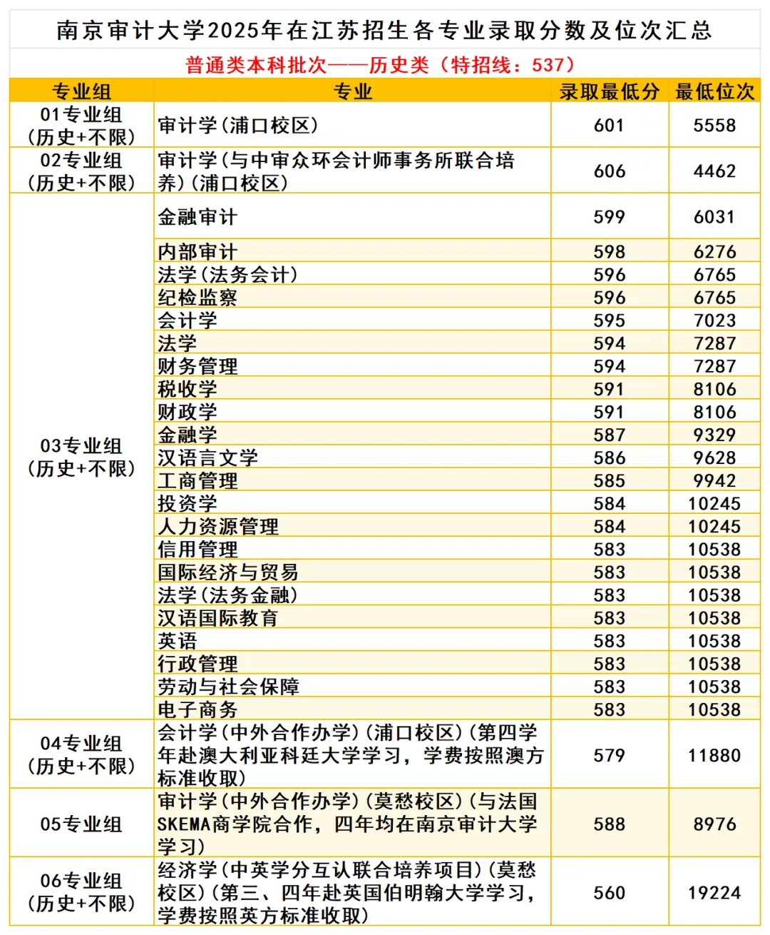 历史类最高606分(审计学【与中审众环会计师事务所联合培养】),最低560分(经济学【中英学分互认联合培养项目】)。