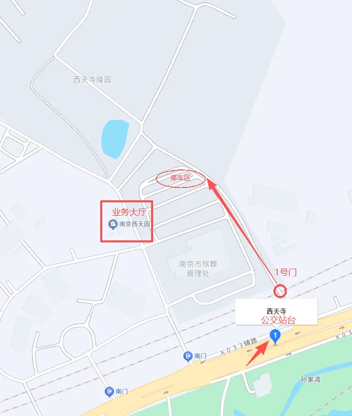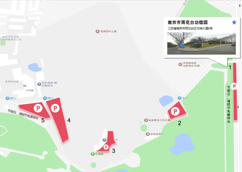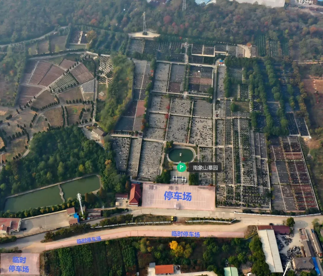 导航南象山墓园停车场(南门)及红敬线沿路临时停车场。