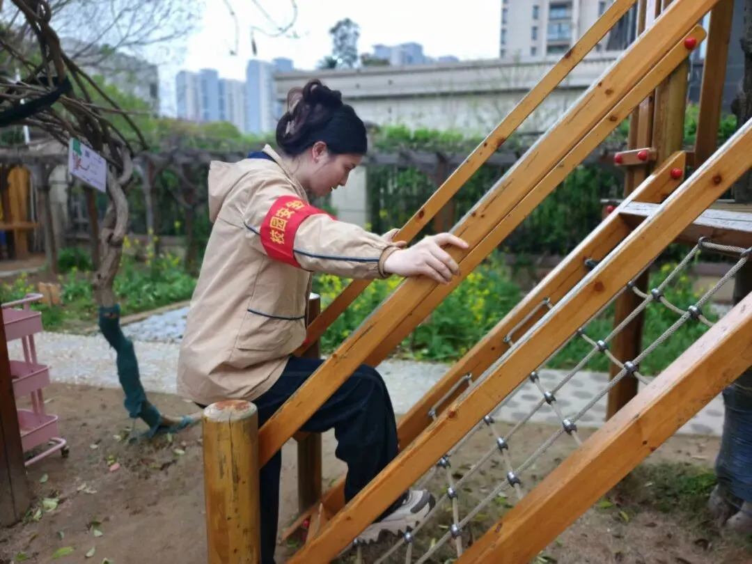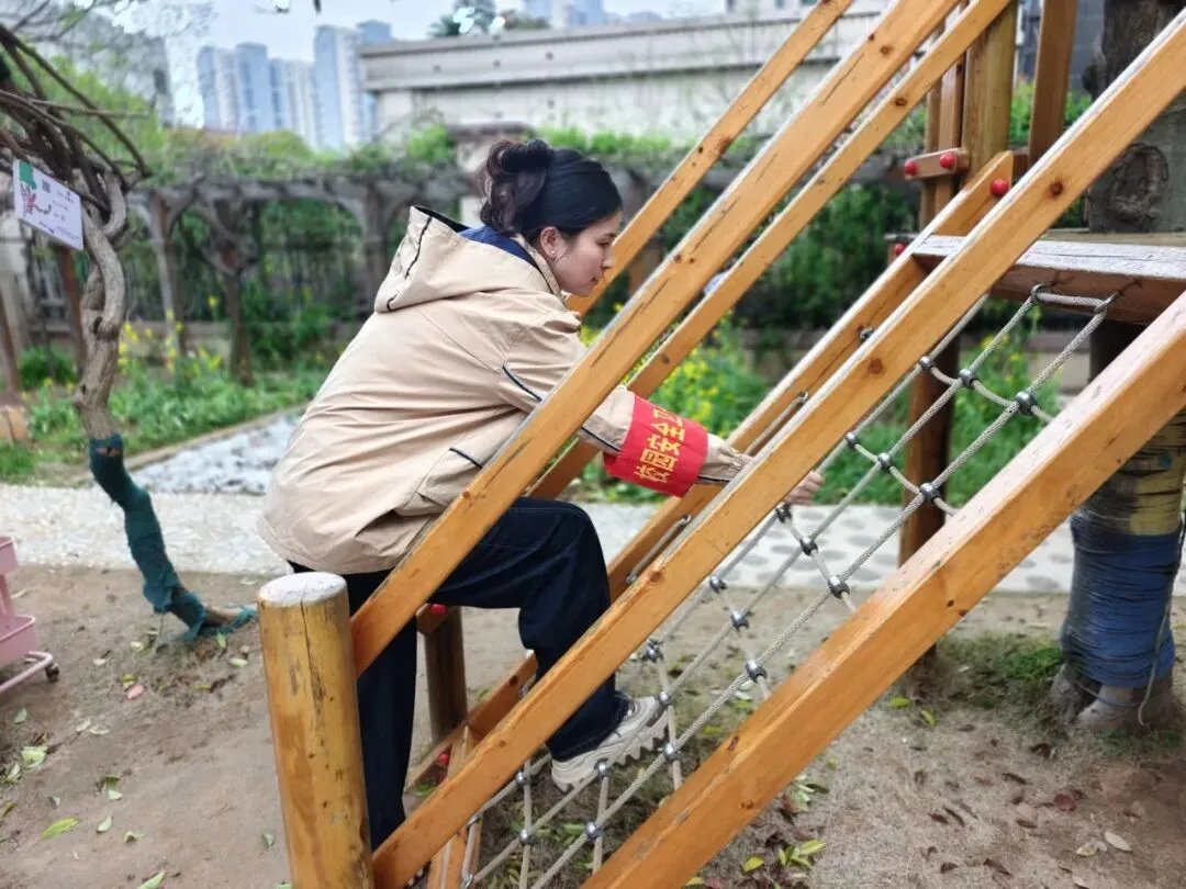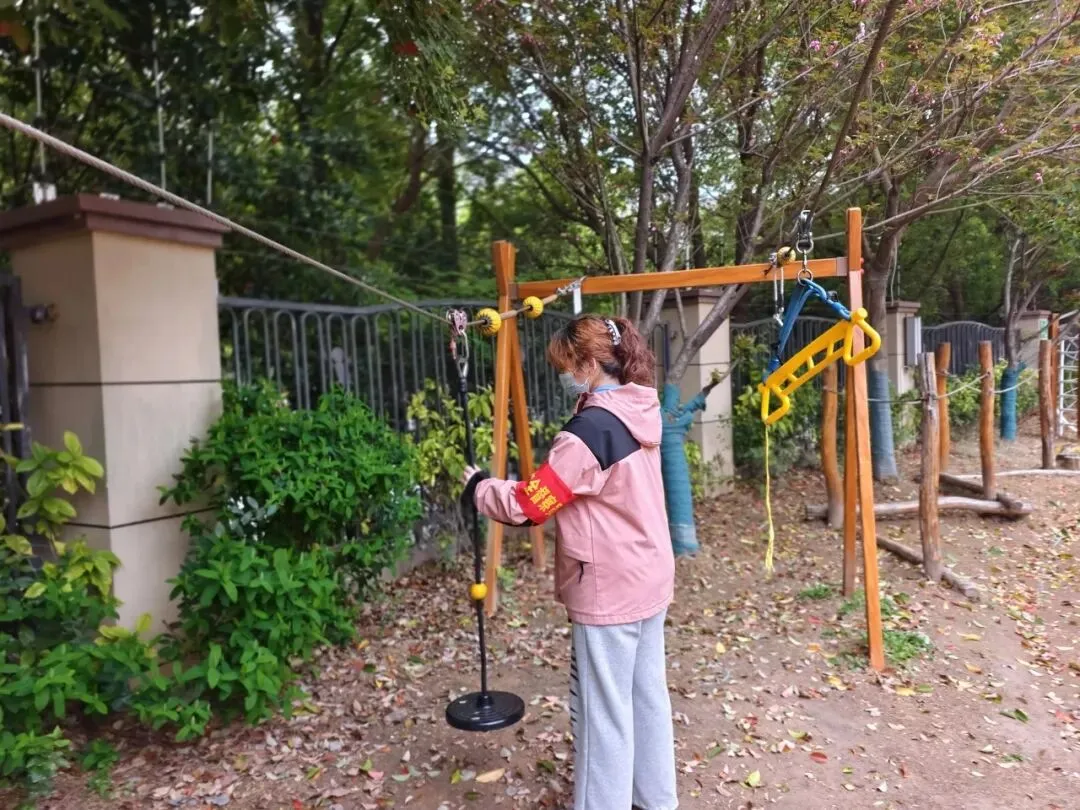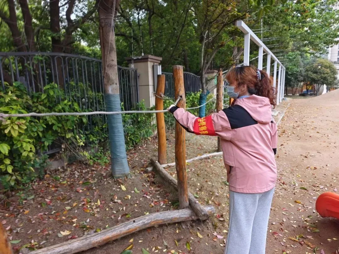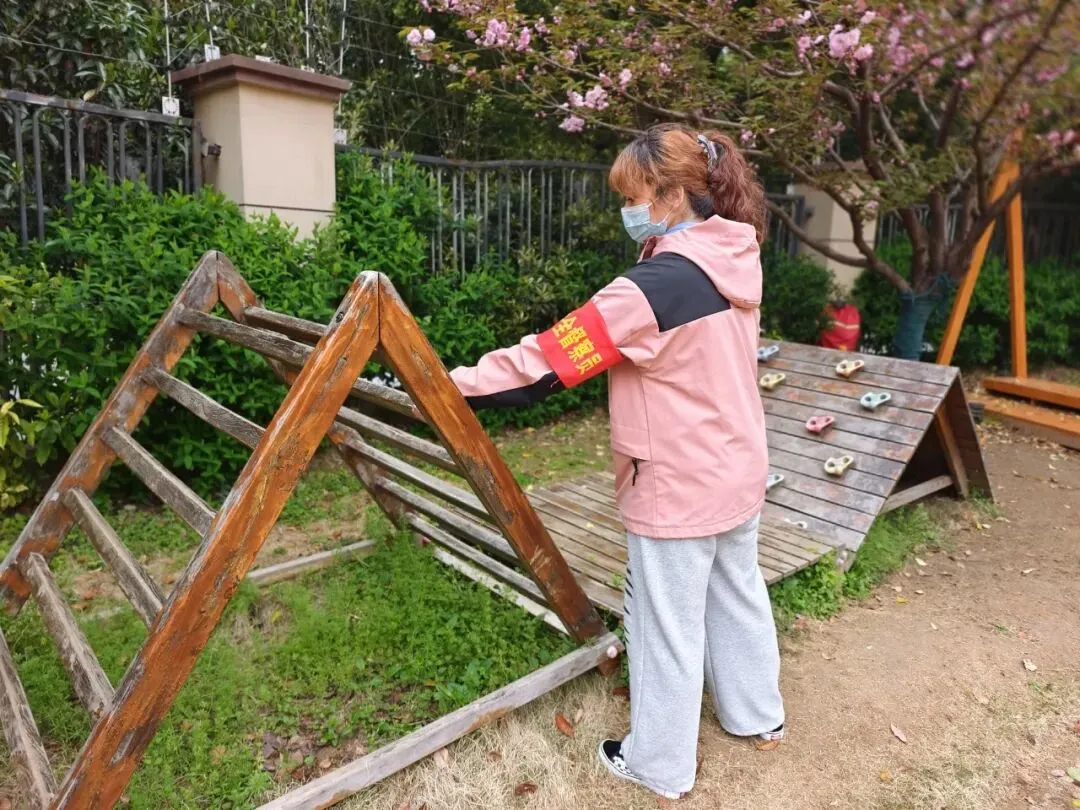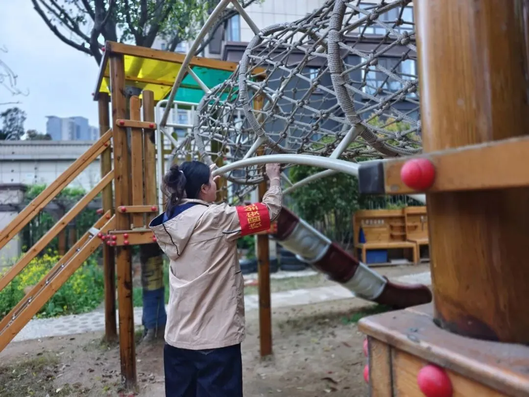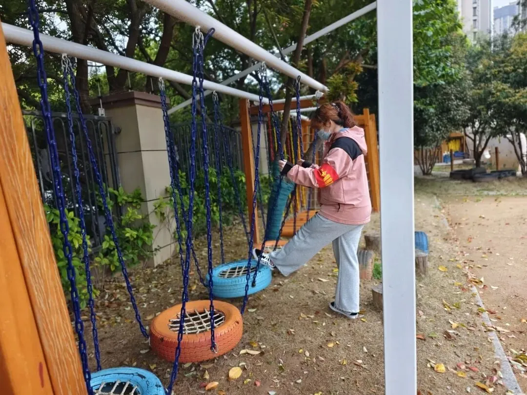 户外活动区是幼儿活动的重要场所,是安全隐患排查的重中之重。安全工作小组对大型玩具设施进行检查,查看是否牢固,零件是否有破损、松动。