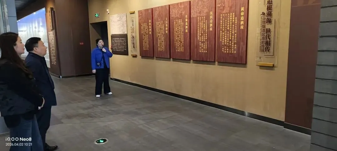 抵达酒文化园后,刘风监事长首先在大厅观看鲁酒文化宣传片,光影交织中,宁阳县作为“谷物酿酒发源地”的历史底蕴跃然眼前。在讲解员引导下,团队依次参观大汶口文化长廊、鲁酒文化博物馆、酒文化艺术长廊及三十二酒坊场景复原展区。通过“北依泰山、南邻曲阜”的地理优势解析,结合土地肥沃、泉水优质的自然条件,鲁酒从古至今的发展脉络被生动还原。刘风监事长驻足于古老酒器、酿酒工具前,不时记录并提问,深入探讨先民生活智慧与酿酒技艺的关联。
