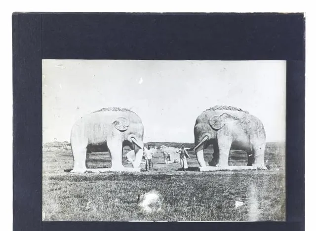 大象全身都是整块石头凿出来的,四条腿蹲得实在,鼻子下垂还带点弯弧,耳朵贴脑袋,身上已经有点岁月的痕迹了,风化斑驳却一点没少那股威劲,老照片里大象背上还蹭着些泥,再细看看,象牙没了,就剩两个黑洞洞的窝,小时候我爸路过还专门顺着象鼻子拍两下,说能保平安,其实也就是图个吉利。