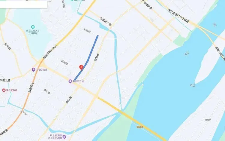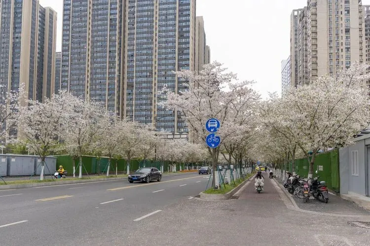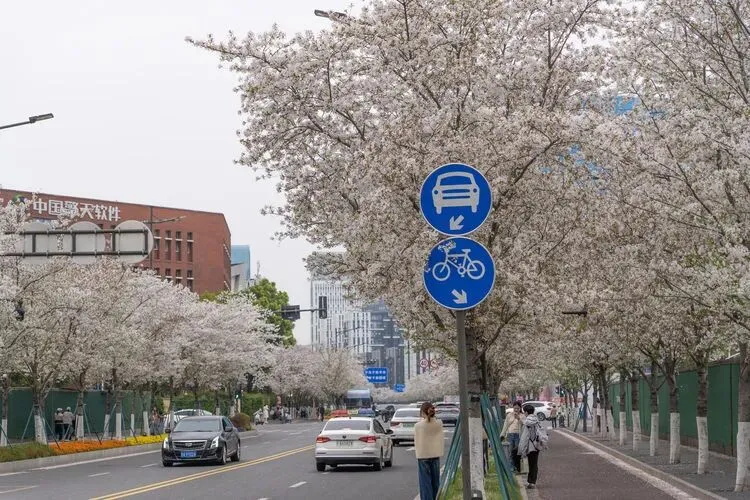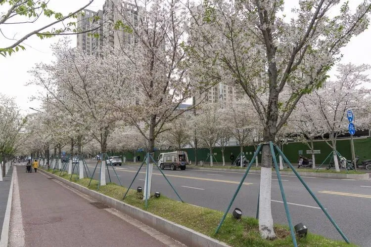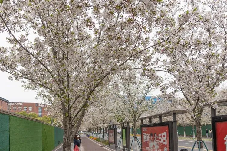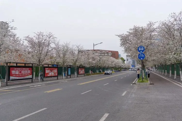 这条路东起万寿路,西至浦口大道。整条道路两侧和慢车道旁边都种植的樱花树。