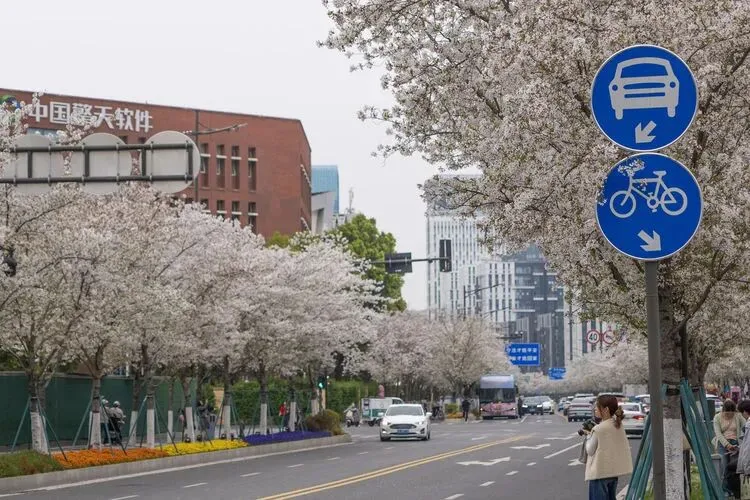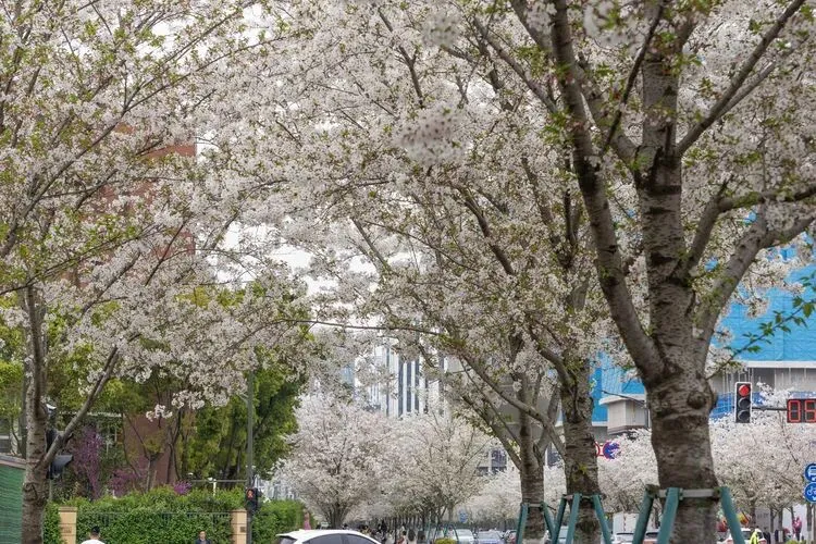 随着南京城市建设的发展,有很多街道的行道树都越种越有特色,这条凤滁路的两侧行道树就都是樱花树。到了这个季节非常漂亮。