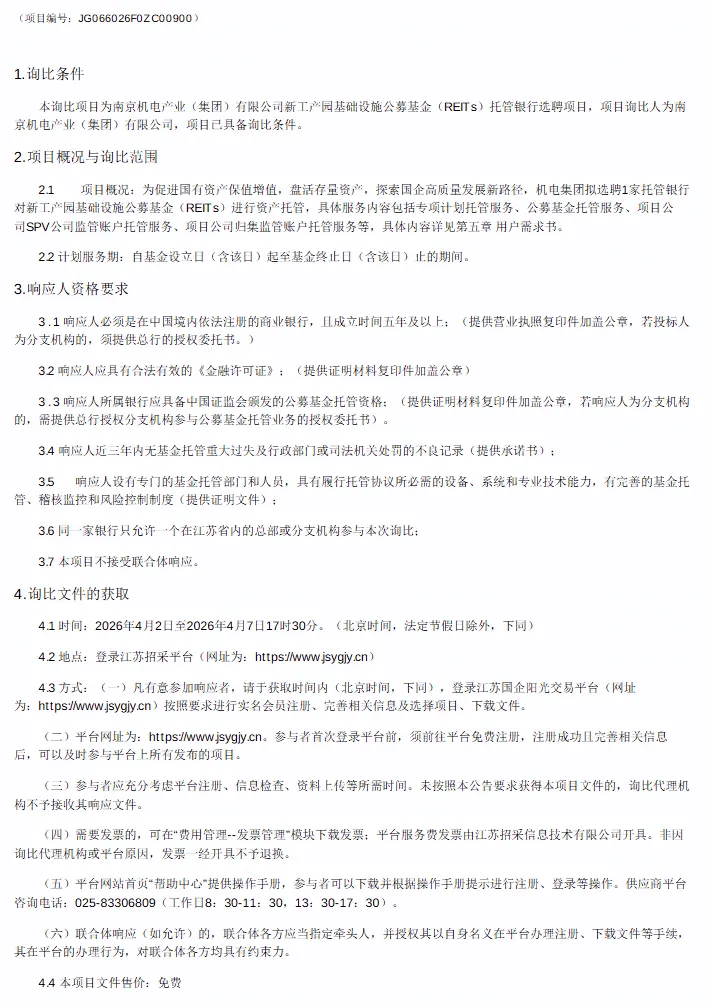 南京机电产业(集团)有限公司新工产园公募REITs托管行选聘询比公告
