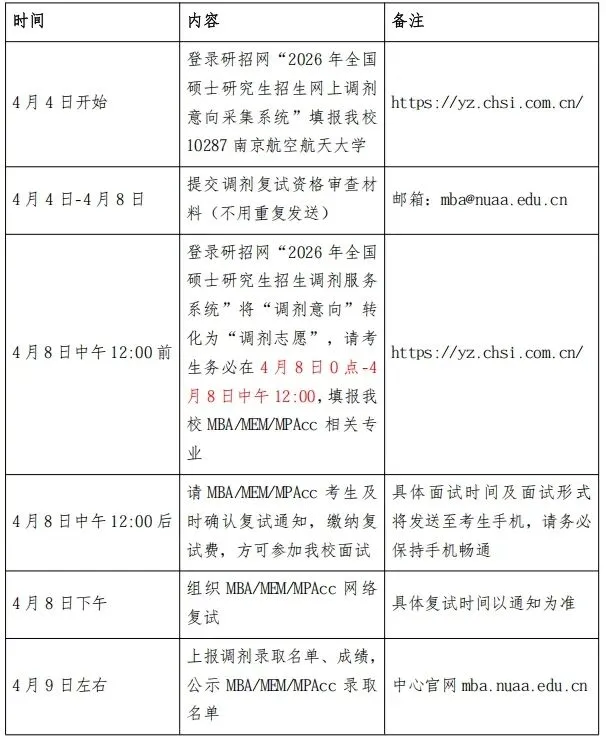 请所有申请调剂的考生于4月8日前在线提交资格审查材料,要求清晰有效,所有文件整合转换成一个PDF文档,发送到邮箱 mba@nuaa.edu.cn,邮件名为:姓名+专业名称+调剂复试审查材料+准考证号。材料清单如下: