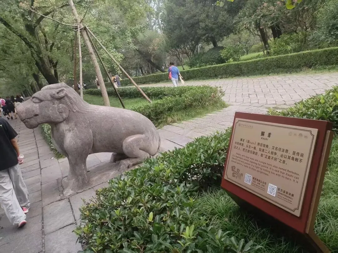这些石兽,每一尊都有讲究。陵前放骆驼,是明孝陵的首创,背后是明初国力强盛、西域安宁的底气;那只独角的獬豸,是传说里辨是非、触奸邪的 “任法兽”,立在陵前,守的是 “正直不阿” 的本心。它们不只是帝王陵的装饰,是礼仪,是守护,更是一个王朝刻在石头上的胸襟与规矩。