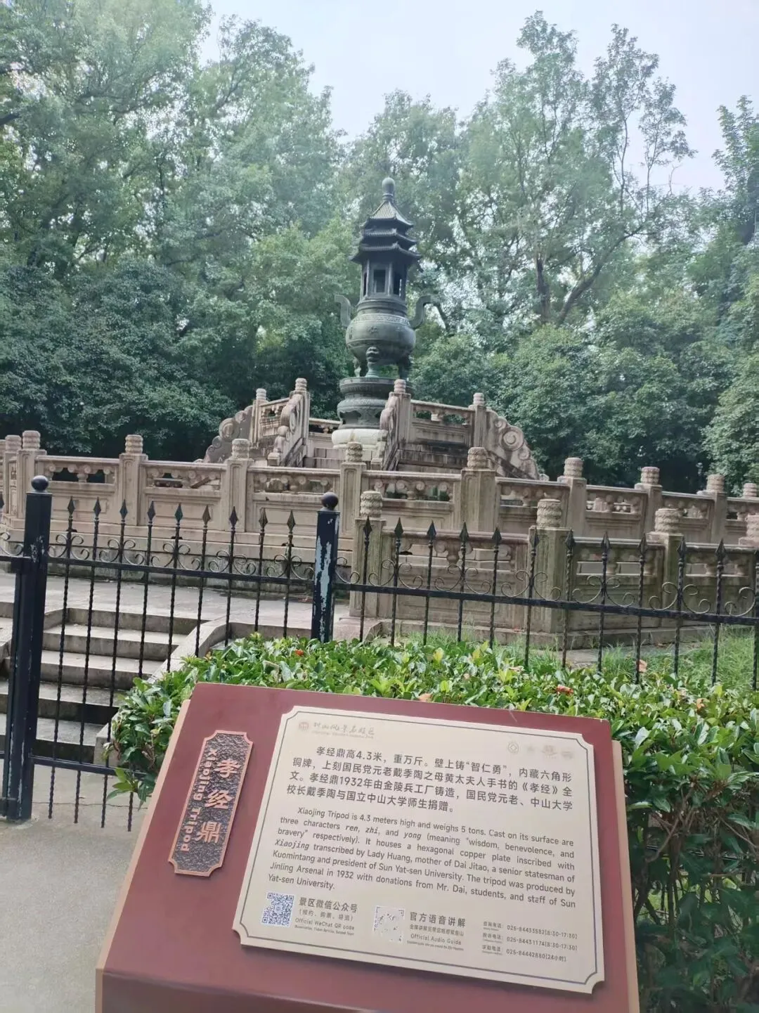 陵前的孝经鼎,总有人驻足细看。这座鼎高 4.3 米,重达万斤,鼎壁上铸着 “智仁勇” 三个字,鼎内还藏着一块铜牌,刻着《孝经》全文。它是 1932 年由金陵兵工厂铸造,当年国立中山大学的师生,与国民党元老戴季陶一同捐赠,把对先生的敬意,熔进了这万斤铜铁里。