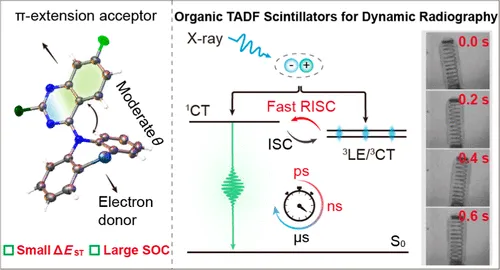 将高三重激子利用率与快速辐射发光相结合的有机闪烁体,对于实现高分辨率动态X射线成像至关重要。热激活延迟荧光(TADF)闪烁体为高效三重态捕获提供了一条有吸引力的途径,但传统系统在辐射发光效率与衰减寿命之间存在固有权衡。这一限制源于固有缓慢的反系统交叉(RISC),难以加速,因为最小化单重态–三重态能隙(ΔEST)通常会降低自旋轨道耦合(SOC)。