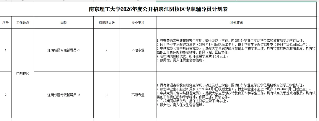 附件:《南京理工大学2026年度公开招聘江阴校区专职辅导员计划表》