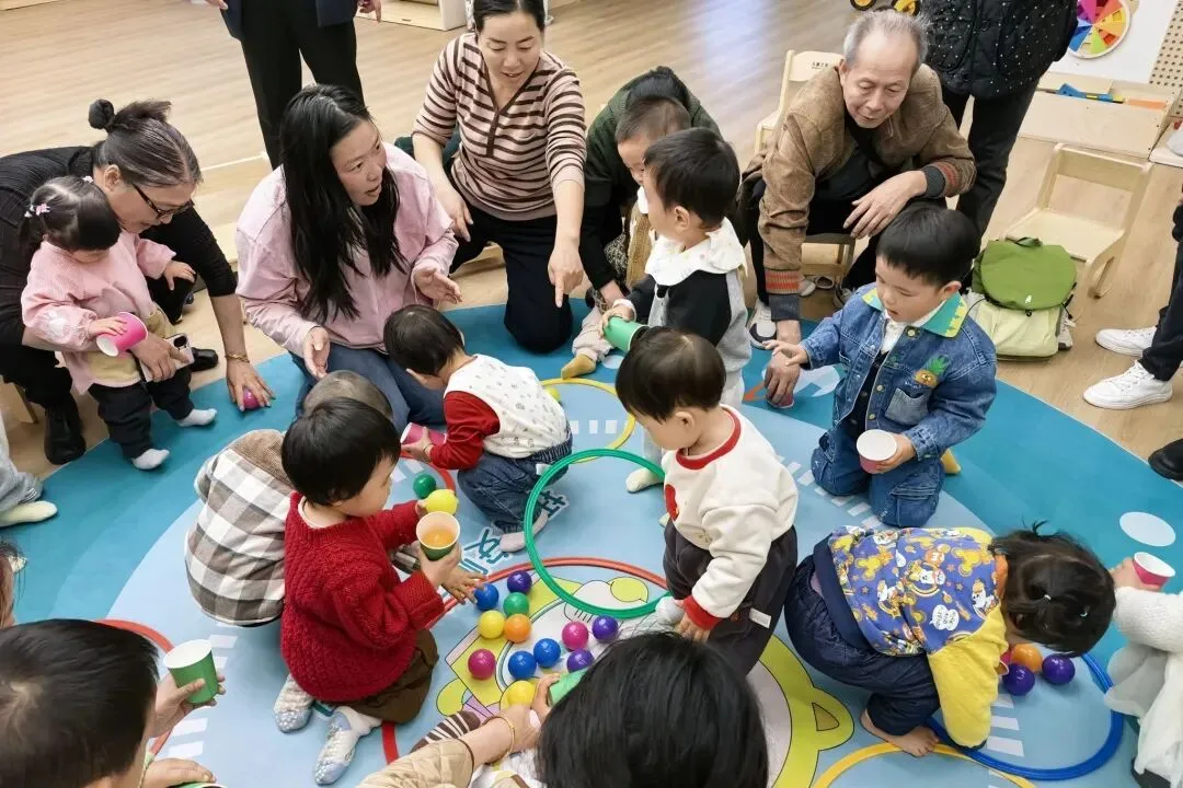 活动现场,教师团队以“五感课程”为载体,运用海洋球、感统圈、彩虹伞等教具,开展了感统游戏、亲子互动、家庭指导等系列活动,助力幼儿提升肢体协调与社交能力,同时引导家长在亲密互动中掌握科学照护技巧,强化亲子情感联结。现场氛围温馨热烈,家长们在交流育儿经验的同时,对园区“专业、规范、有温度”的托育服务给予高度评价。