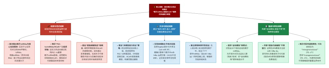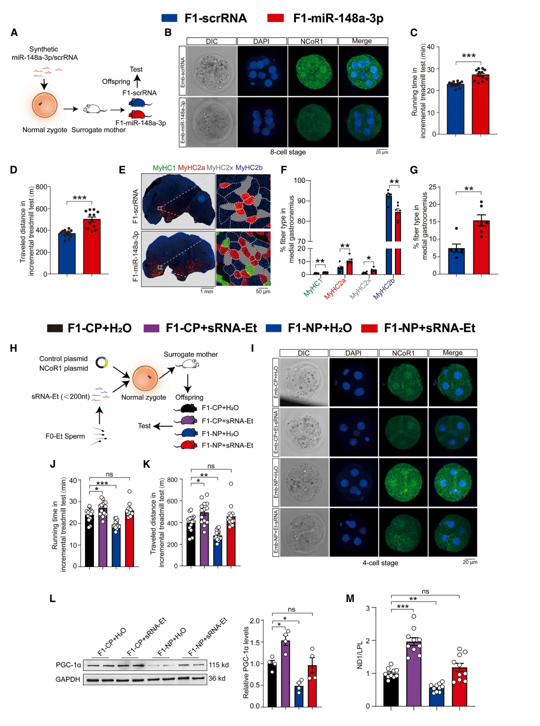 本研究发现,父系运动通过上调精子中的特定miRNA(如miR-148a-3p),在早期胚胎中抑制NCoR1表达,从而重编程代谢网络,促进后代骨骼肌线粒体生成和氧化型肌纤维转化,最终增强耐力并改善糖代谢。