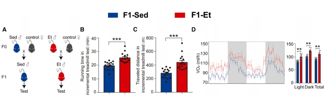 结果令人振奋:F1-Et子代跑动距离和持续时间均显著超过 sedentary 父系子代(F1-Sed)【图1B-C】,耗氧量和能量消耗也更高【图1D】,而心脏功能无差异。