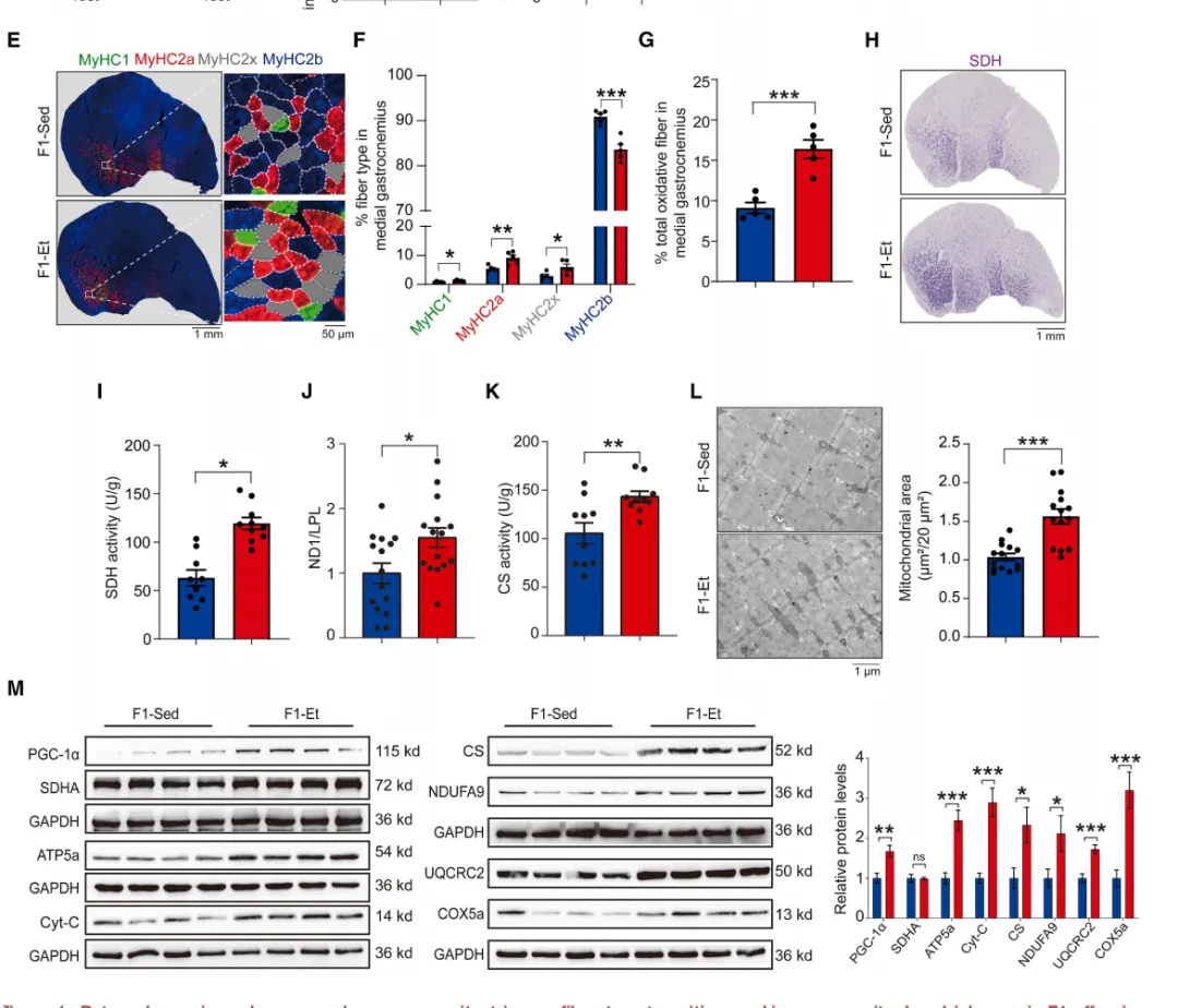 耐力提升的背后是肌肉发生了“质的改变”。免疫荧光显示,F1-Et子代 gastrocnemius 中氧化型肌纤维比例显著增加,糖酵解型IIb纤维减少【图1E-G】。
