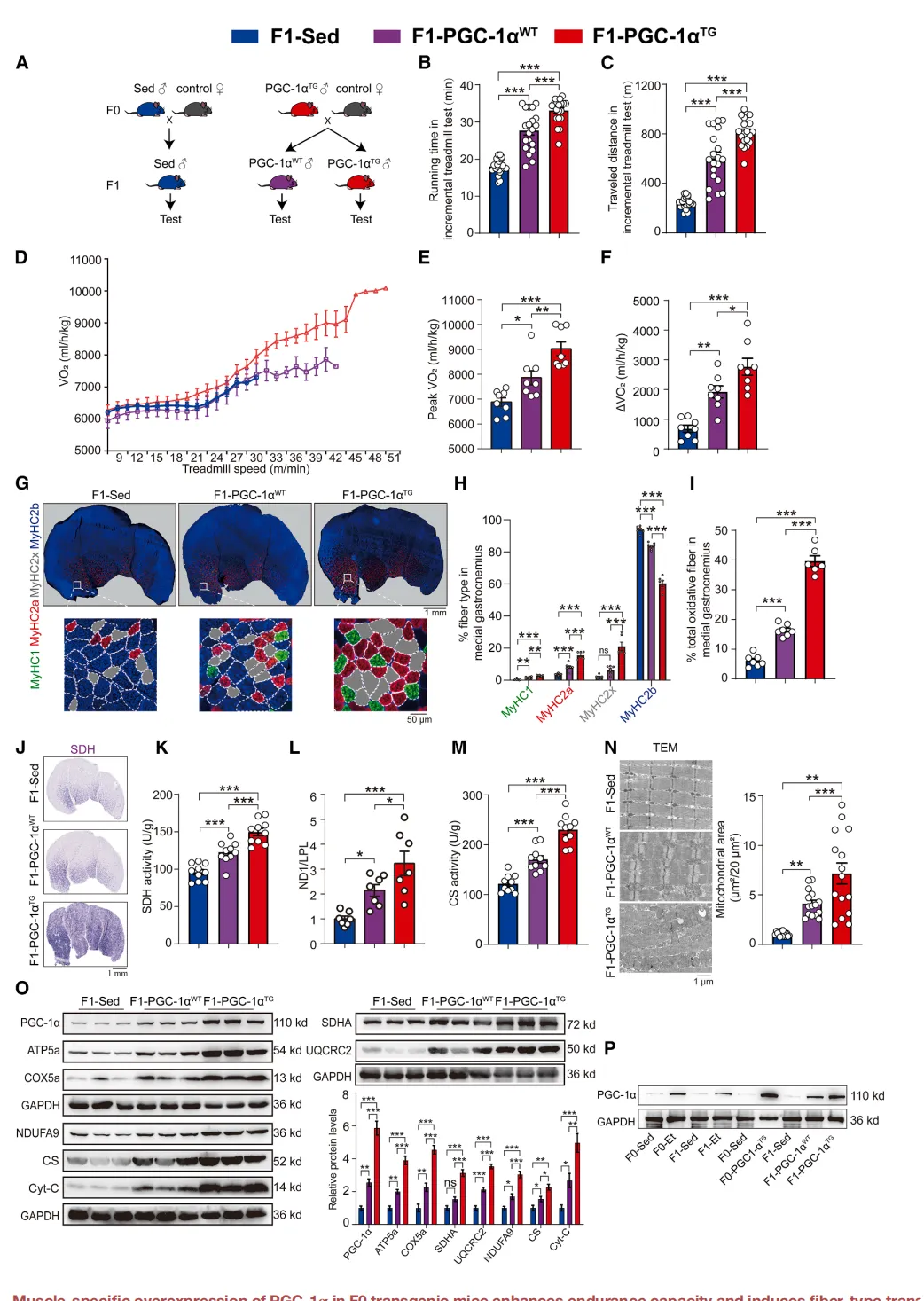 结果令人意外:这些“空转”子代仍表现出更强耐力,峰值VO₂提升14%【图2B-E】,氧化纤维增加,线粒体增多【图2G-N】,表型与F1-Et高度相似。