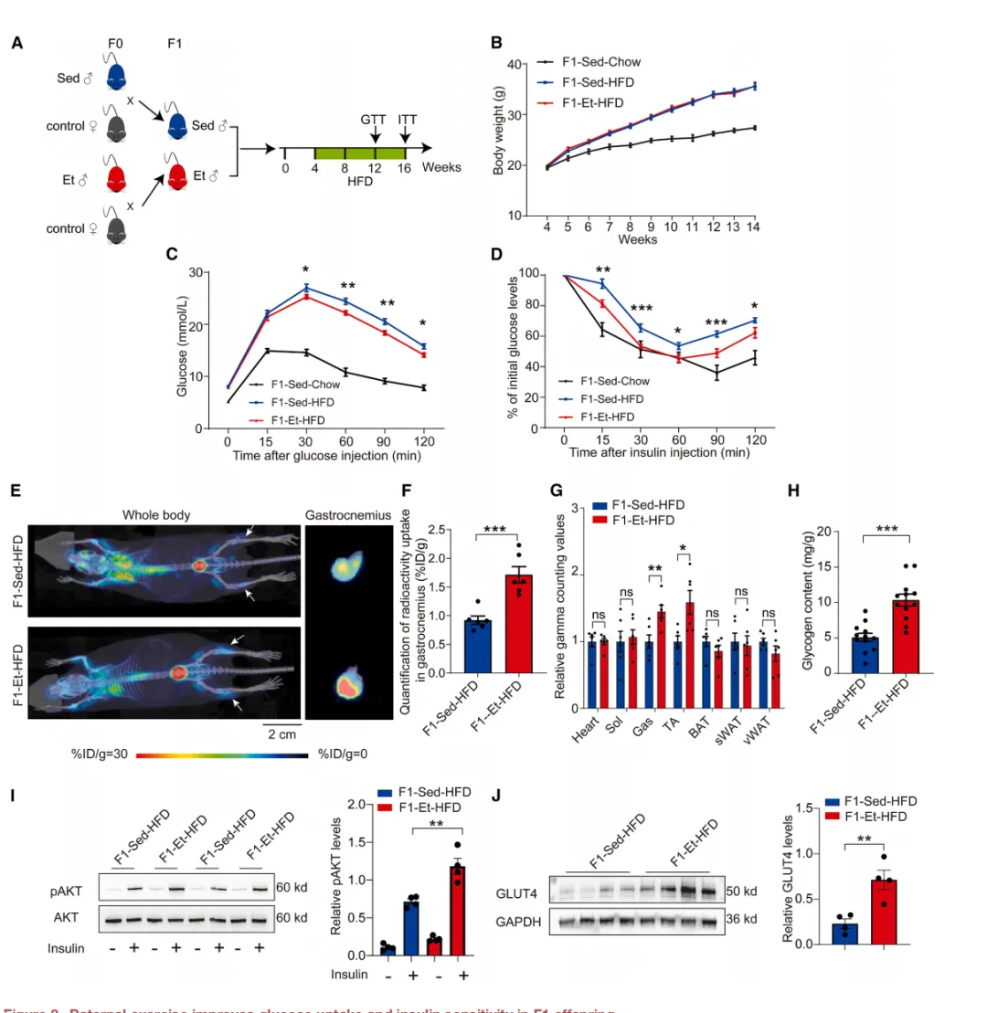 结果令人鼓舞:F1-Et-HFD组的葡萄糖耐量和胰岛素敏感性均显著优于F1-Sed-HFD组【图3C-D】。